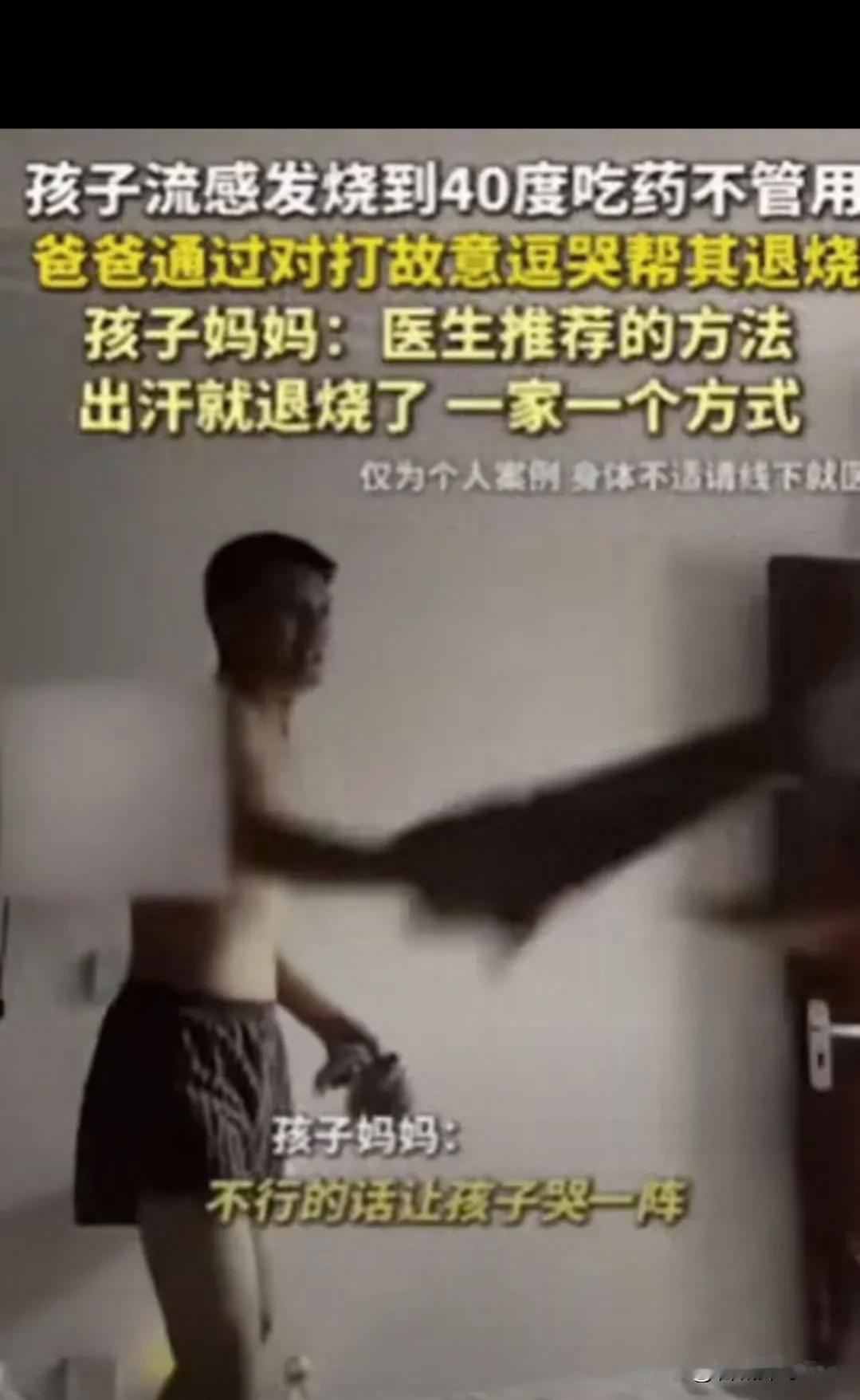 太有头脑了!河北一孩子发烧到40度,吃药不管用,不料,爸爸竟然故意惹孩子生气,然后假装和儿子对打,孩子打不赢,委屈得不行,被打得崩溃大哭! 没想到看到孩子哭了,爸爸却笑了,妈妈也不帮忙,妈妈透露:这是医生推荐的方法,出汗就退烧了 ,一家一个方式! 这则视频火了之后,评论区吵翻了天。有人觉得这爸爸“剑走偏锋”有智慧,也有人质疑“拿孩子情绪换退烧,到底值不值”。要搞明白这事,得先从发烧的原理和“出汗退烧”的逻辑说起。 发烧是人体对抗病毒、细菌的免疫反应,当体温超过38.5℃时,确实需要通过药物或物理手段降温,而出汗是身体散热的重要方式之一。 医生所说的“出汗退烧”,本意是通过增加代谢、扩张毛孔来散热,比如让孩子喝温水、温水擦浴,或者在医生指导下用一些温和的方法促进排汗,绝非鼓励家长用“逗哭”这种可能伤害孩子心理的方式。 孩子爸爸的做法,本质上是家长在孩子高烧不退时的无奈尝试。流感发烧来势汹汹,有时候退烧药起效需要时间,家长看着孩子烧到40℃,心里那种焦灼感是外人难以体会的。但这种“偏方式”育儿,隐藏着不小的风险。 孩子在生病时本就身体虚弱,情绪剧烈波动可能导致脱水、电解质紊乱,甚至引发高热惊厥;更重要的是,“故意惹哭”的行为会让孩子对父母产生不信任感,尤其是年纪小的孩子,可能会误以为“爸爸妈妈在欺负我”,这种心理创伤远比一次发烧更难修复。 再看妈妈说的“医生推荐的方法”,这里大概率是对医生建议的误读。正规医院的医生,绝不会让家长用“逗哭”的方式给孩子退烧,更可能是在沟通中提到“促进出汗有助于降温”,家长结合自己的理解和情急之下的焦虑,才衍生出了这种“对打逗哭”的操作。 这也反映出一个普遍问题:家长在育儿过程中,对医学知识的一知半解,很容易把科学建议走偏成“民间偏方”。 类似的“奇葩退烧法”其实不少,有人给孩子裹厚被子“捂汗”,有人让孩子喝烈酒(当然这是极端错误的),还有人用各种土方子擦身。这些做法之所以存在,是因为家长对“发烧”的恐惧——怕烧坏脑子、怕引发肺炎,这种恐惧驱使他们尝试各种“速效方法”。 但真正的科学育儿,应该是在理解医学原理的基础上,结合孩子的个体情况,在医生指导下选择安全、温和的方式,比如遵医嘱用药、物理降温、保证孩子水分摄入,同时密切观察精神状态,而不是寄希望于“一招制胜”的偏方。 当然,我们也能理解家长的心情。谁也不想看着孩子难受,可“爱之深”更要“谋之远”。育儿路上的每一个选择,都得在“有效”和“安全”之间找平衡。 促进出汗退烧的思路没错,但方式可以更温柔、更科学。与其让孩子在委屈中大哭出汗,不如给孩子泡个温水澡、喂点淡盐水,或者用温毛巾擦拭身体,这些方法同样能达到排汗散热的效果,还不会伤害孩子的情绪和信任。 这事儿也给所有家长提了个醒:面对孩子生病,焦虑解决不了问题,先冷静下来搞清楚医学原理,再去执行方法,别让“好心”办了“坏事”。毕竟,孩子的身体健康重要,心理安全感同样重要。 各位读者你们怎么看?欢迎在评论区讨论。