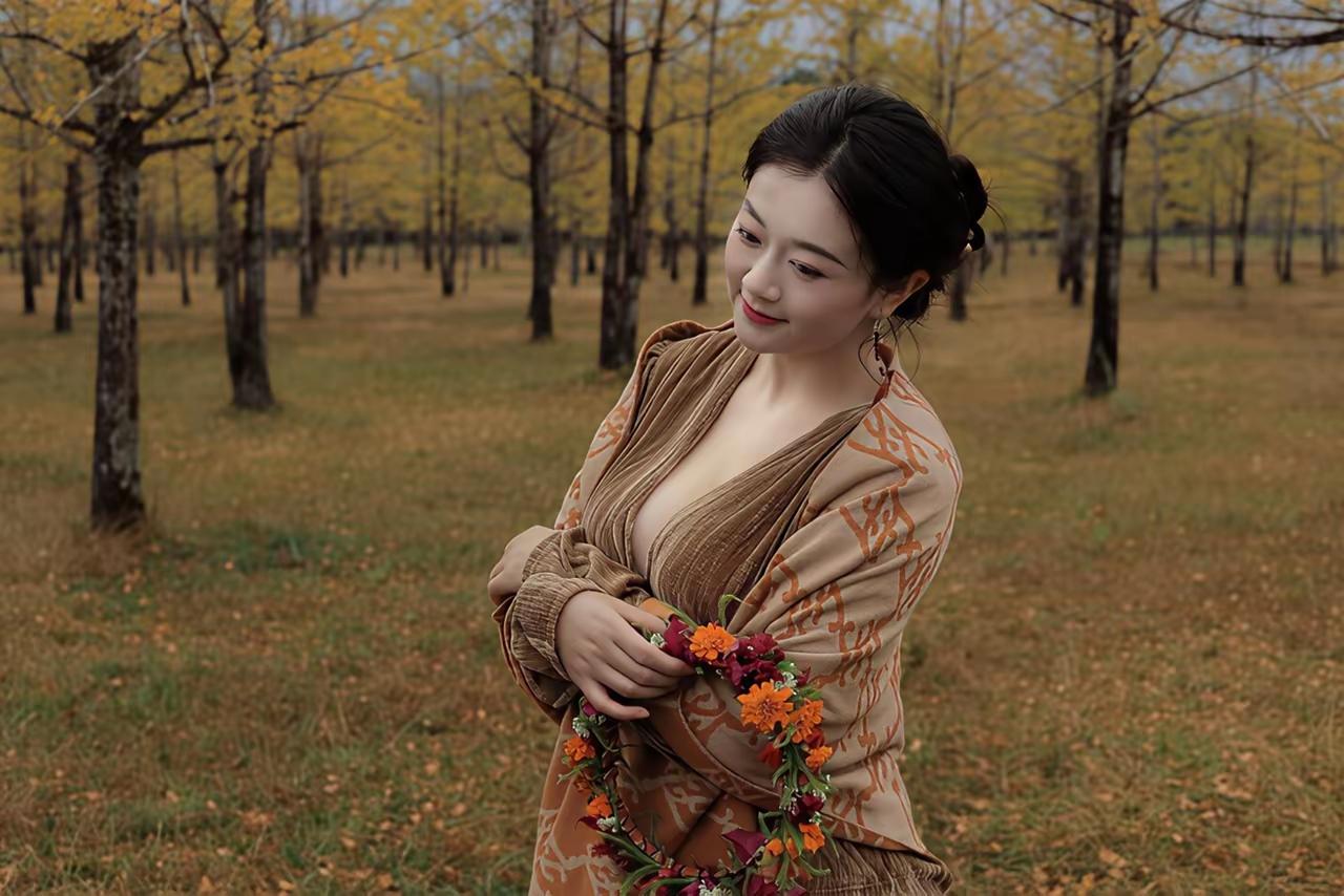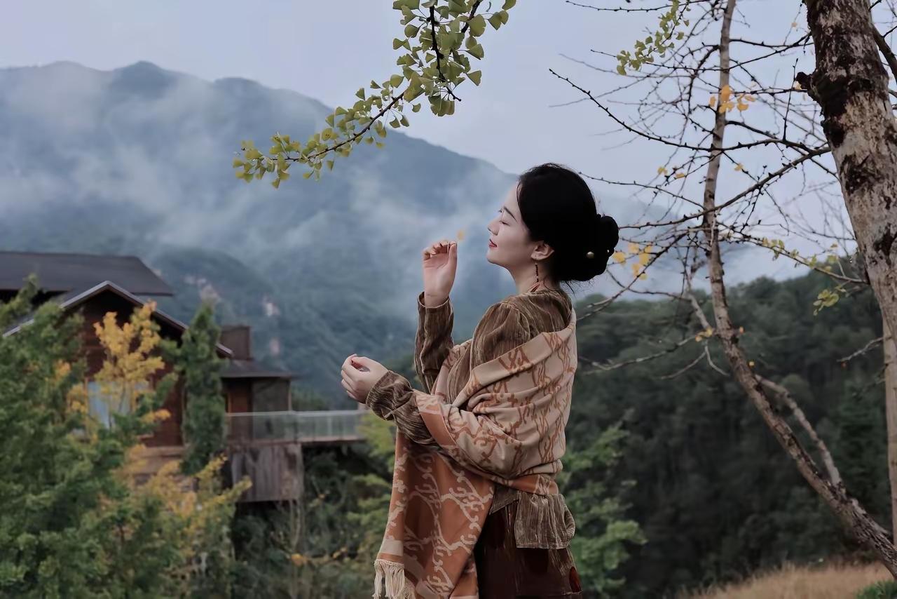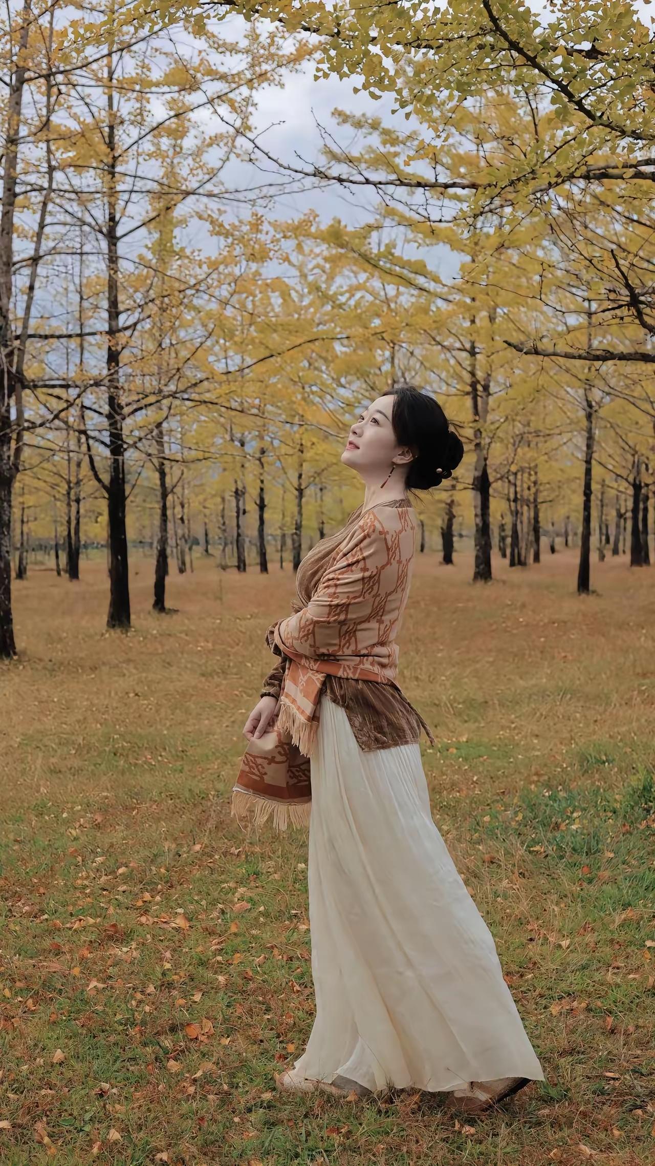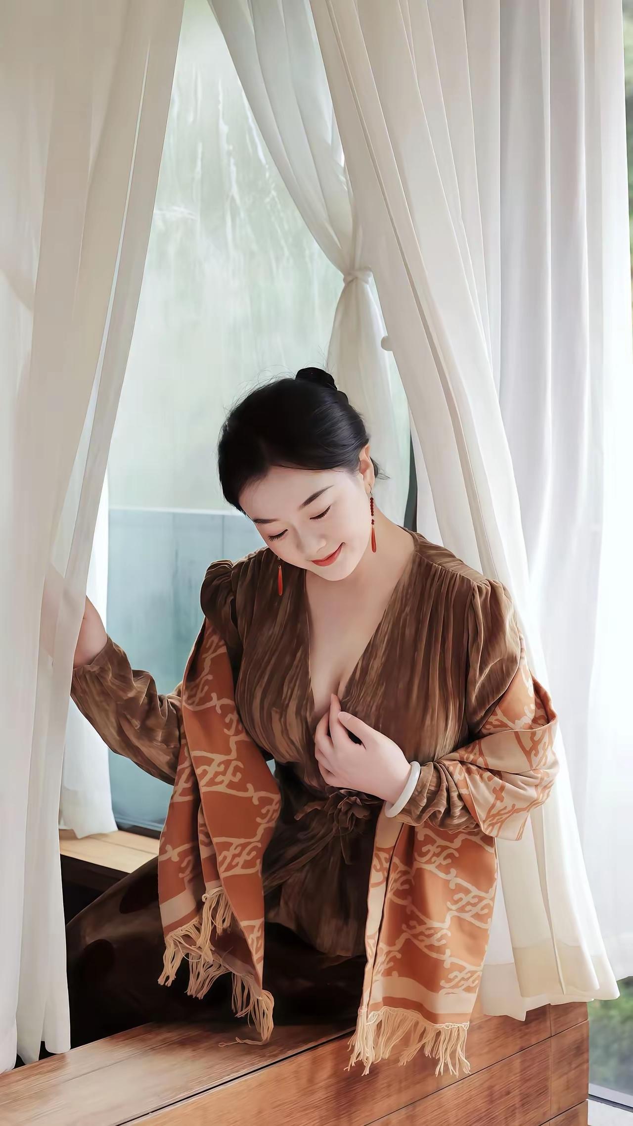 复古风穿搭,优雅气质,复古棕色调,搭配白色窗帘,尽显女性魅力。