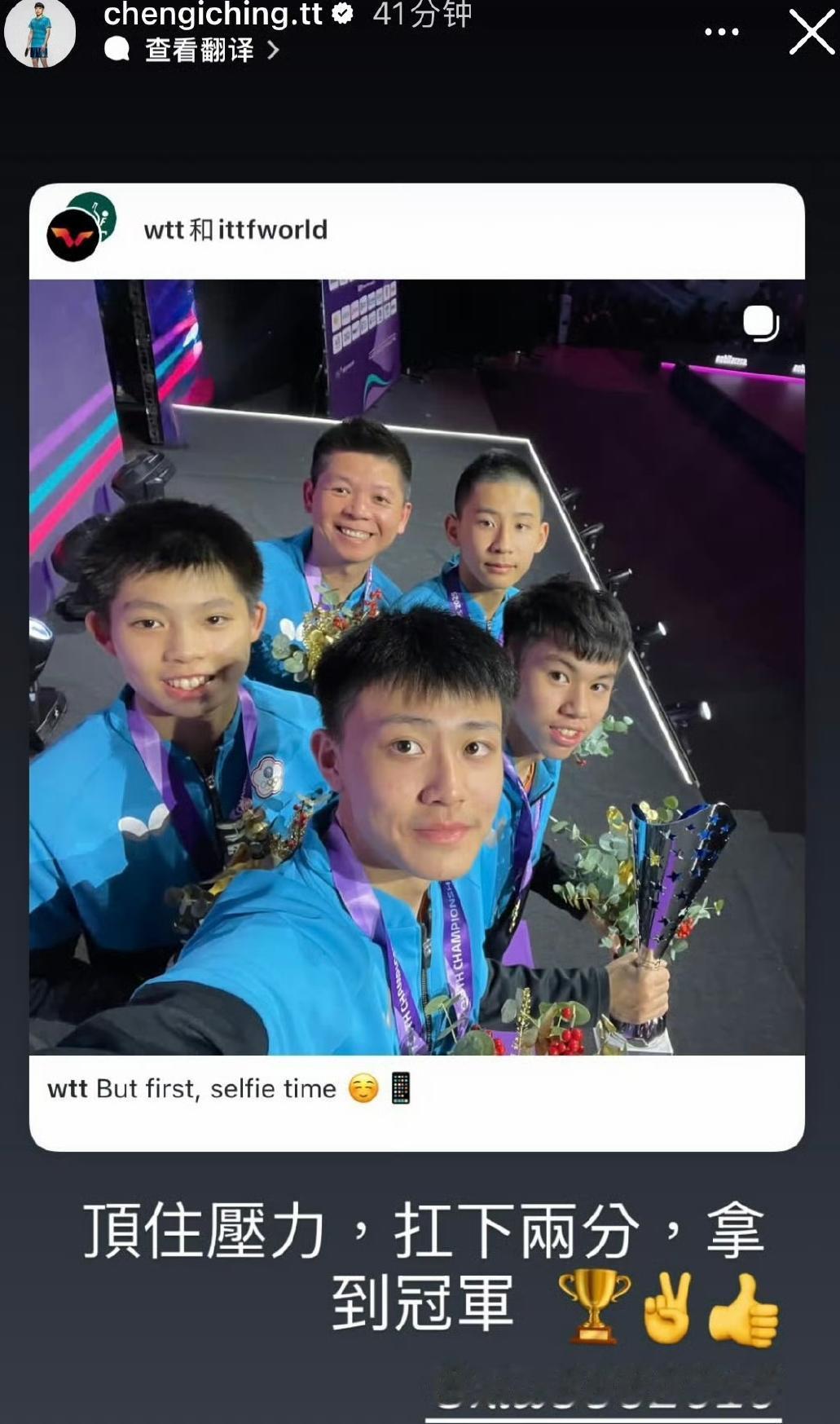 乒乓球世青赛U15男团决赛,中国台北队3-2力克意大利队,收获冠军,郑怡静的弟弟郑旻独得两分,姐姐特意发文祝贺,中国队最终与韩国队并列获得第三名。