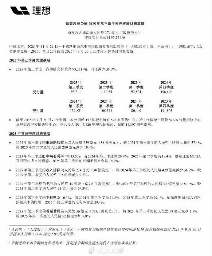 理想发布了Q3财报,交付 9.32 万台,单季度营收274亿元,前三季度营收835亿元;车辆毛利率15.5%,综合毛利率 16.3%(剔除MEGA召回因素为 20.4%),主动召回MEGA,对利润率影响还是挺大的。另外李想表示理想i8、i6正在提产,明年年初i6产能稳定在2万台,明年L系列也会迎来全新换代,到时候看看效果怎么样。理想汽车发布三季度财报理想汽车大v聊车