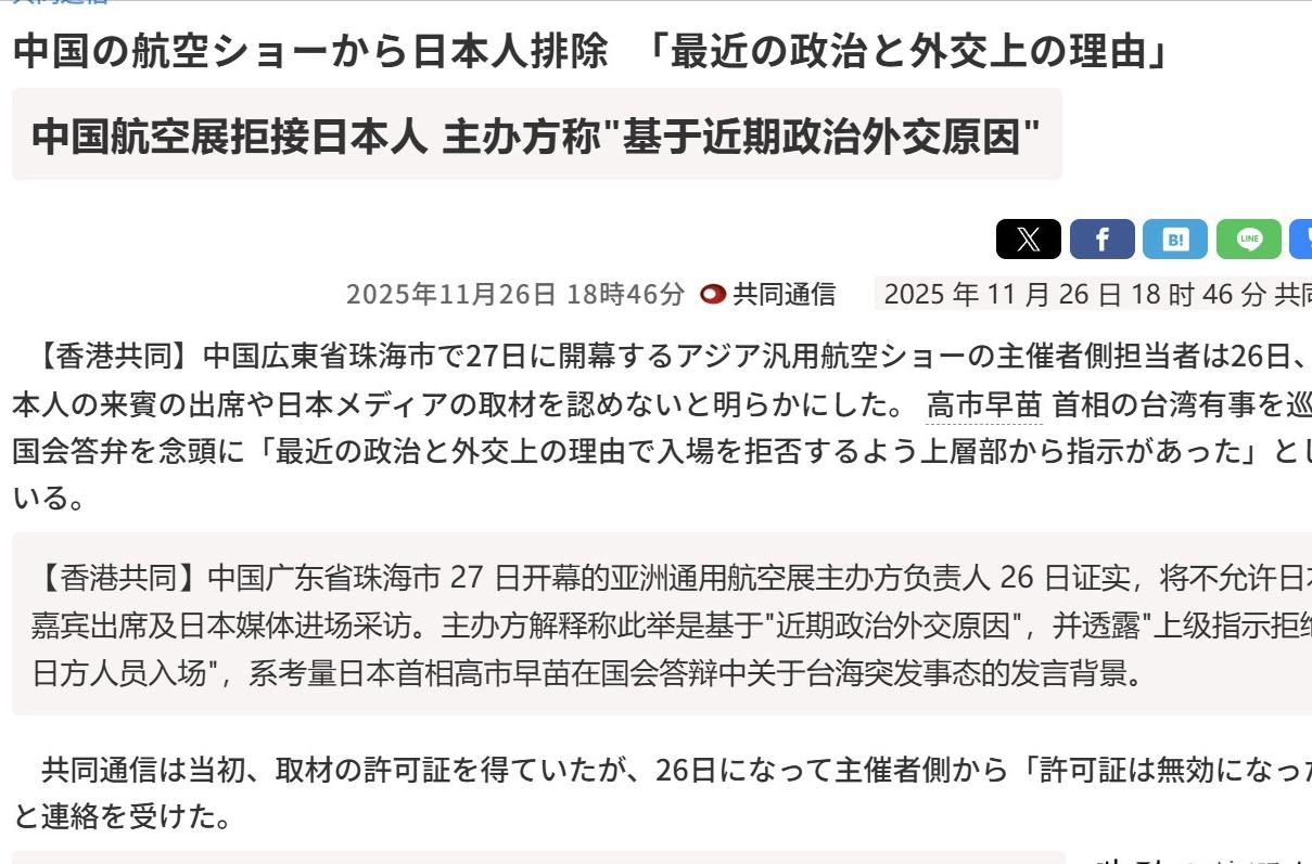 珠海航展拒绝接待日本人!日本共同社报道称,中国广东省珠海市 27 日开幕的亚洲通用航空展主办方负责人 26 日证实,将不允许日本嘉宾出席及日本媒体进场采访。 即便日本共同社等媒体此前已拿到官方采访许可证,也被临时通知证件作废。这一干脆利落的决定,以 “近期相关原因” 为由,没有多余修饰,却在中日交往的脉络中留下了清晰的印记。 据主办方透露,此举源于 “近期政治和外交上的原因” 及上级指示,而近期中日关系的诸多波澜恰好提供了注解。 日本首相高市早苗在涉台问题上的不当国会答辩、日方提议的 2026 年 1 月中日韩首脑会议遭中方拒绝等事件,早已让双边关系处于紧绷状态。 今年 6 月日本相关机构还与台湾方面签署无人机产业合作备忘录,公然触碰一个中国原则的红线,这种无视中国核心利益的行为,显然不可能不影响双方在各领域的交流氛围。 有人疑惑,航展本是技术交流的平台,如此操作是否过于生硬?但回顾国际交往的常态便会发现,这绝非无端排斥,而是对等反制的清醒选择。 2023 年日本岩国航展就曾明确不对中国人开放,过往多届国际航展中,部分国家也常对中国籍人士设置军事展品参观限制。 更不用说日本媒体此前报道中国航展时,屡次用恶意滤镜扭曲画面、抹黑中国制造。“人怎样待我,我便怎样待人”,中国向来珍视平等交流的机会,但绝不容忍单向的歧视与挑衅,这次的决定正是对这种不公待遇的合理回应。 这一举措更是必要的自我保护。通用航空技术看似民用,实则包含大量军民两用的核心技术,各国在这类敏感领域的交流中都会保持必要的谨慎。 近年来日本连续 12 年增加防卫费、制定战时相关法律,在军事扩张的道路上越走越远,同时在南海、台海等问题上频频干涉中国内政。 在这样的背景下,限制日方参与相关航展,本质上是防范技术泄露、维护国家利益的底线操作,毕竟没有哪个国家会在核心安全问题上含糊其辞。 事件发酵后,网上出现了不同声音,有人拍手称快,认为这是对挑衅行为的有力回击;也有人担忧影响国际交流。但无论何种看法,都不能忽视一个核心前提:交流的基础是相互尊重。 中国始终欢迎各国基于平等与善意参与合作,本次珠海航展也吸引了国内外约 400 家企业参展,持续四天的飞行表演和技术展示,依然彰显着开放的姿态。 拒绝日本方面入场,并非关闭交流的大门,而是明确传递出 “尊重才能同行” 的信号 —— 任何国家想要参与中国的发展进程,都必须遵守中国的底线,尊重中国的核心利益。 这场看似简单的准入风波,实则是中日关系的一个缩影。它告诉我们,国家间的交往从来不是单方面的妥协,而是相互理解与尊重的双向奔赴。 日本若想重新获得参与这类交流的机会,或许需要先反思自身的行为,停止在敏感问题上的挑衅,用实际行动展现合作的诚意。毕竟,大门永远为尊重规则的人敞开,而对于无视底线的挑衅者,中国从不缺乏说 “不” 的勇气。
