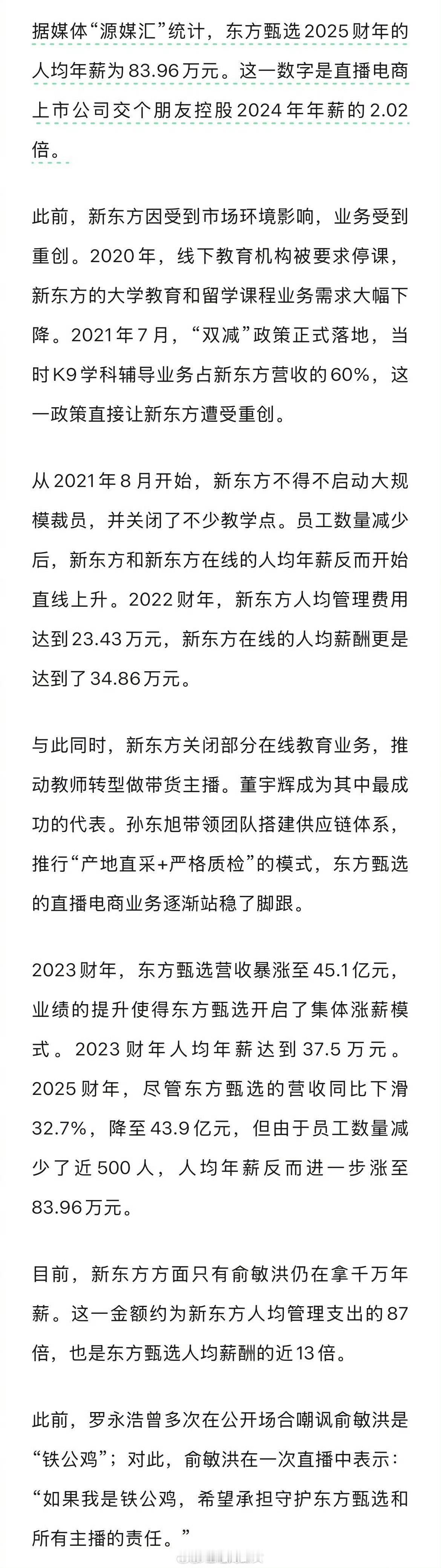 俞敏洪不再是“铁公鸡”!东方甄选年薪曝光,人均83万东方甄选人均年薪83万