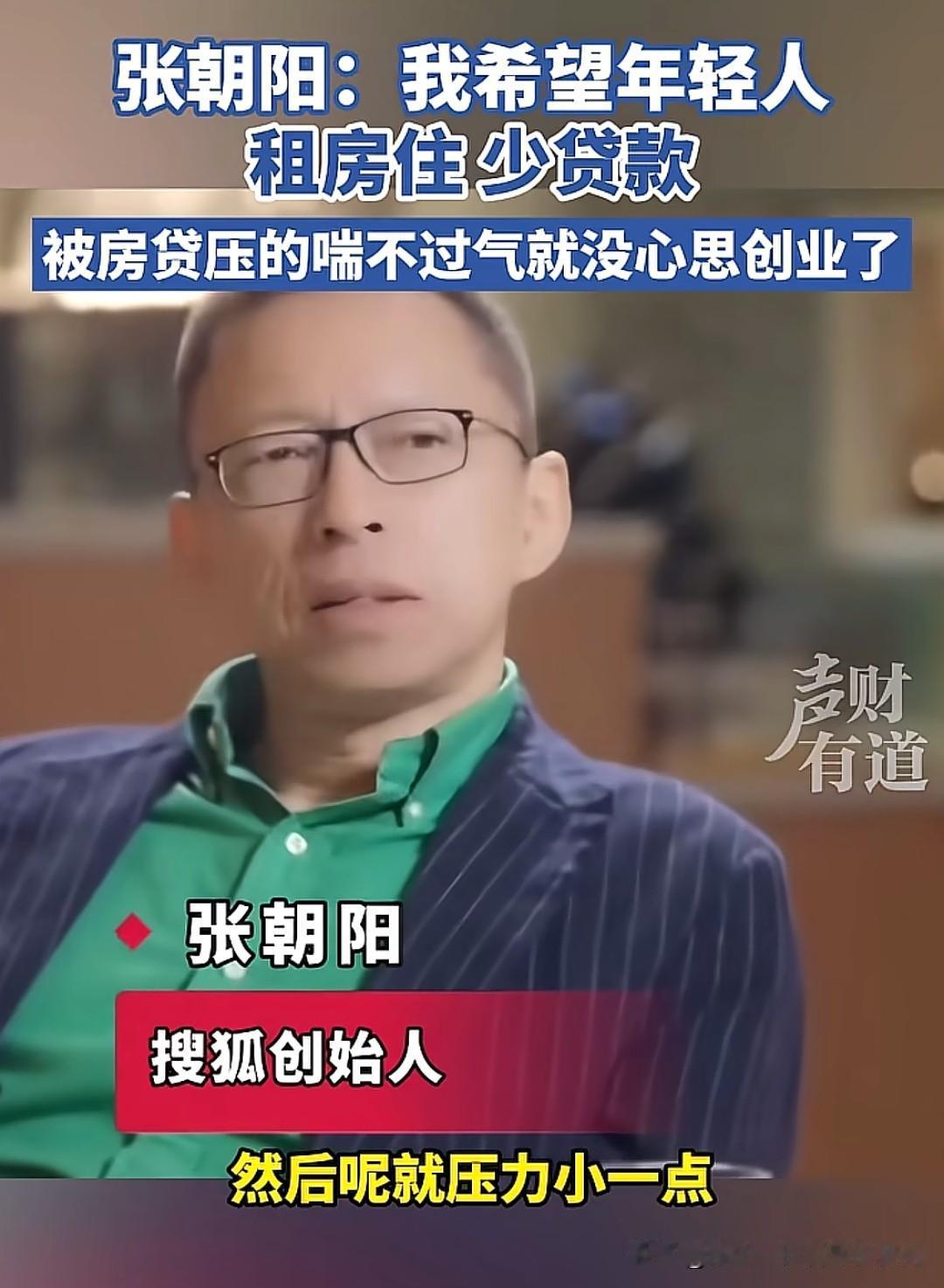 张朝阳呼吁现在的年轻人尽量选择租房,少贷款,这样创业的时候压力就会小一些。在张朝阳眼里,年轻人有买房的钱应该优先考虑创业,等创业成功了再去买房就没什么压力了。 如果创业失败了呢?可能就真的一无所有了。家里能兜底的年轻人不需要考虑创业,直接买房,结婚生子,然后按部就班的上班,生活基本步入正轨。如果没有,除了高薪工作,剩下就是冒险创业了,虽然会失败,但不去试一试又怎会知道结果呢? 如果不试会怎样?人生可能就没什么盼头了。这并不只是租房的问题,你租房的话,以后孩子上学等等都是问题,而且房子也不是说你想租就一直能住,可能经常的需要搬家。况且租房住,哪个丈母娘同意呢!