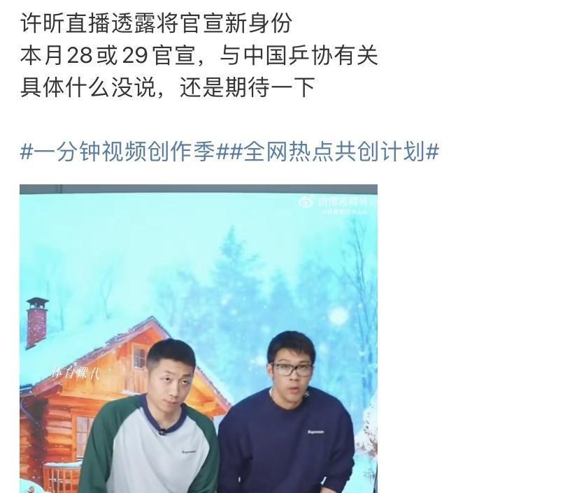 许昕说他的新身份即将官宣,直播说了很多事情。 许昕的这场直播,也是针对现在网上很多的声音, 也是从全运会的比赛开始谈起的。 首先,先说一件关于许昕新身份的事情, 许昕说,28号或者29号, 将会官宣他的新身份, 他现在是亚乒联的副主席,即将要官宣的是中国乒协的职位, 具体是什么职位,许昕没有说,他让大家等官宣。 亚乒联副主席,大概不会做中国乒协的副主席, 所以,可能不是副主席的职位, 目前龙队是副主席。 所以,还真是不好猜, 那就等官宣吧。 新的职位,新的身份,期待中。