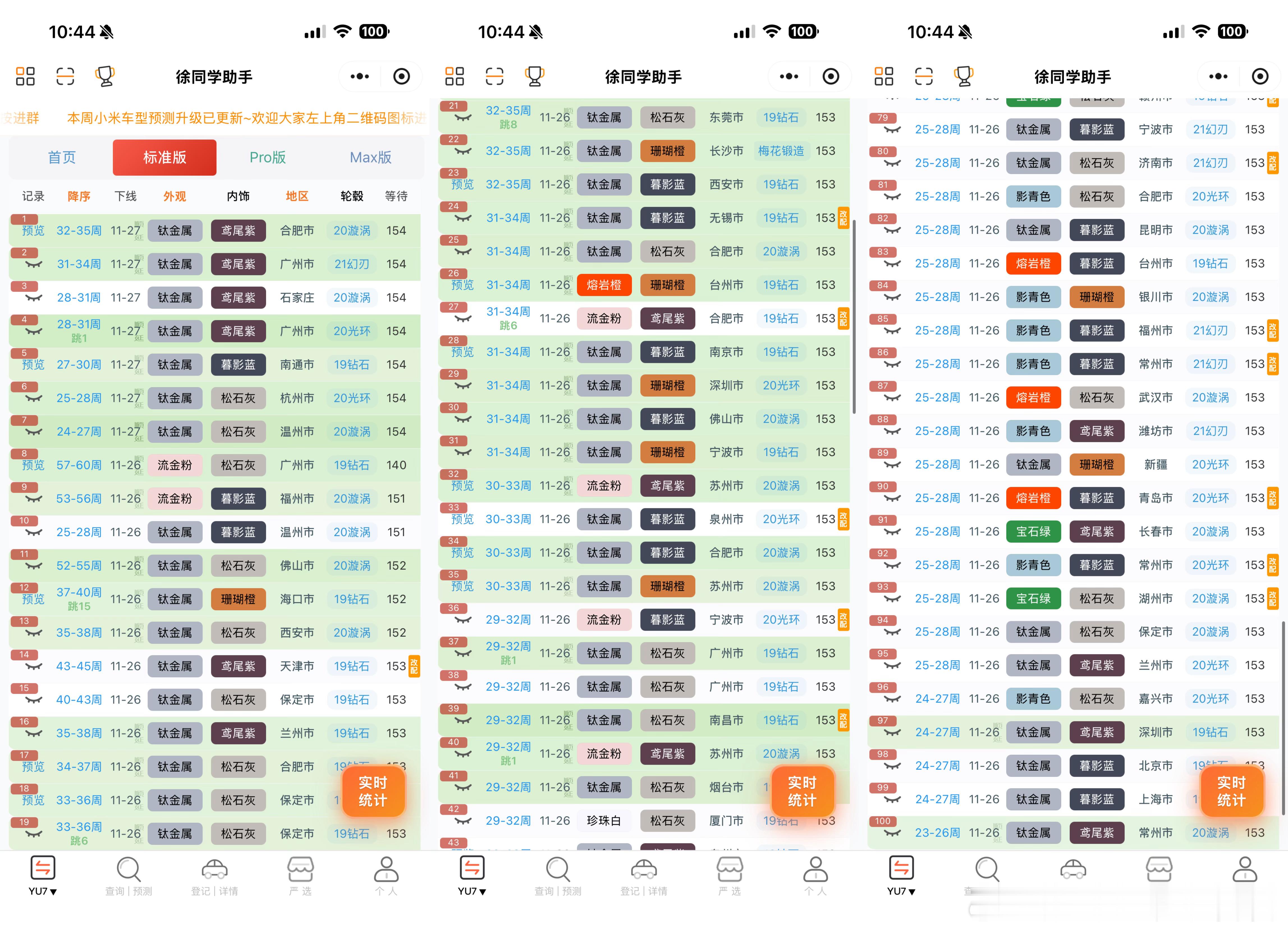 小米汽车(11月27日)下线实况新一波关怀礼来啦,这次是【盖毯】,这份礼物还是相当不错滴,狗东上还卖149呢小米基金会已经向香港捐赠1000万港元用于本次重大火灾,有情有义的雷总,有情有义的小米(切记!!贵重物品的收据最好留个电子档,发生类似事情的时候保险可以赔付)🌀YU7(据不完全统计)合计188台1️⃣标准:下线94台,大部队都在顺延了,31周左右的下线很多,不少50多周的也正常下(据观察,橙+橙+光环下线最快)2️⃣Pro:下线62台,大部队26-31周,跨度比较大,顺延的可能性非常高3️⃣Max:下线32台,大部队到7月份了,30周左右的随时下线,稀有色依旧很多🌀SU7(据不完全统计)合计51台1️⃣标准:下线23台,大部队6-7月份,说不定有一部分能等到新款上市,如果可以改配那多好2️⃣Pro:下线22台,9-11月的随时下线,稀有色很多3️⃣Max:下线6台,没什么车了,观望的比较多4️⃣ultra:无浙江区地区的补贴又来啦…具体细则可以询问一下主管部门哦~更多关于小米汽车的最新资讯和深度解析,请参考【米车派】~徐同学助手汽场全开