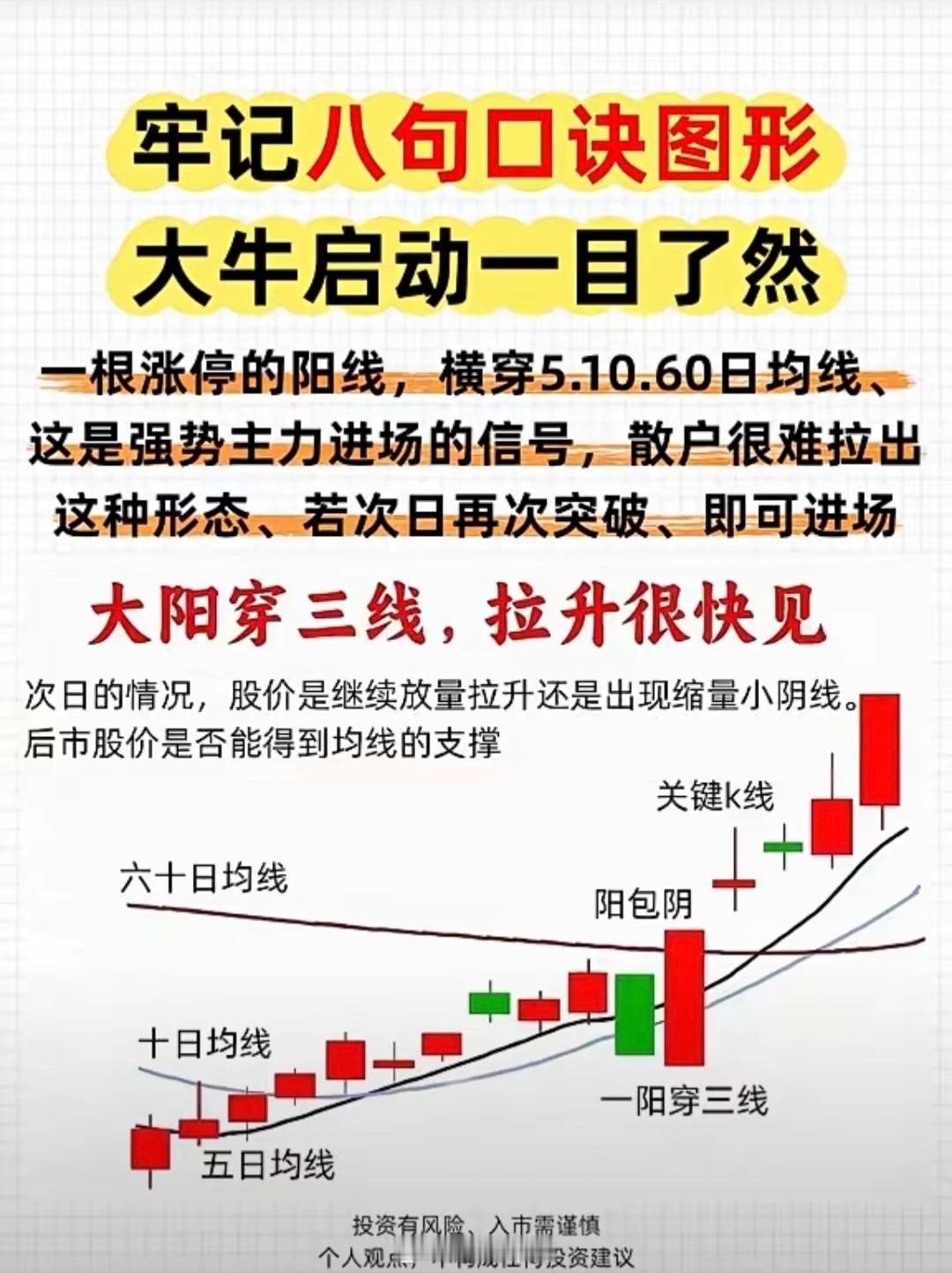 大阳穿三线(一阳穿三线)一、定义单根涨幅≥5%的中/大阳线,同时突破5日、10日、20日(或30日)短期均线,收盘价站于均线上方,是多头强势进攻、趋势大概率反转的经典信号 。二、核心判断条件(缺一不可,避假突破)1. K线要求:阳线实体越长越好,优先光头光脚阳线,上影线过长则抛压大,信号减弱。2. 量能配合:突破当日成交量较前几日放大1.5-2倍,量能不足多为诱多陷阱。3. 均线状态:突破前5/10/20日均线需粘合(间距≤2%),成本一致则抛压小,成功率更高。4. 出现位置:低位横盘/长期下跌后出现最优,上升途中回调后出现可加仓