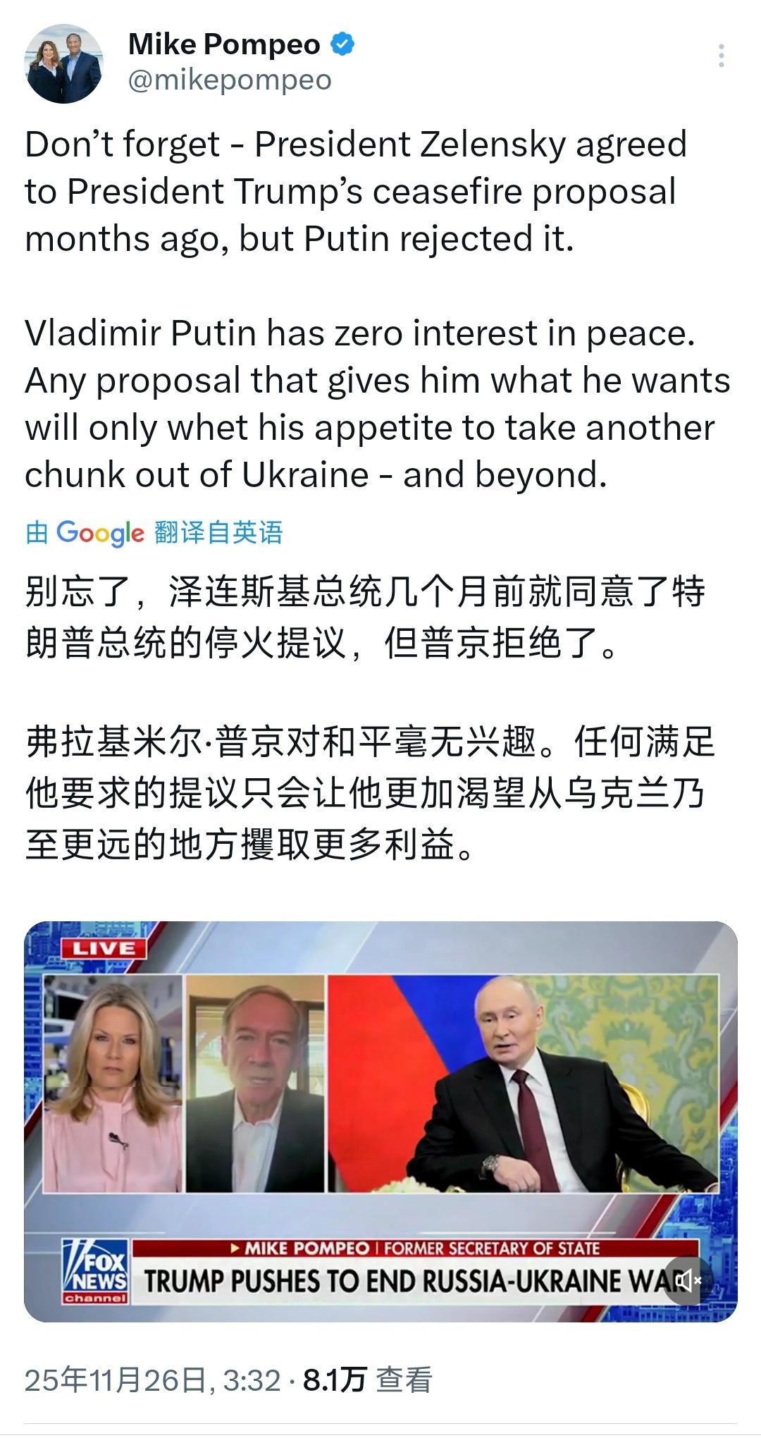 美国前国务卿蓬佩奥11月26日写道:别忘了,泽连斯基总统几个月前就同意了特朗普总统的停火提议,但普京拒绝了。弗拉基米尔·普京对和平毫无兴趣。任何满足他要求的提议只会让他更加渴望从乌克兰乃至更远的地方攫取更多利益。 这番话看似立场鲜明,却恰好撞上当前俄乌谈判的关键节点,背后的各方博弈远比表面的 “谁拒绝和平” 复杂得多。 蓬佩奥口中的停火提议,核心正是特朗普政府近期力推的 “28 点和平方案”。这份由白宫秘密起草的方案涵盖停火安排、领土划分、安全保障等多个方面,特朗普最初还给乌克兰设定了 11 月 27 日的最后期限,威胁若不接受就终止武器供应和情报共享。 面对这样的压力,泽连斯基确实表现出妥协意愿,其高级顾问乌梅罗夫在 11 月 25 日透露,泽连斯基希望尽快与特朗普达成最终协议,对 “日内瓦框架协议” 持开放态度。 但停火谈判从来不是俄乌两国的简单对话,而是多方利益的角力场。特朗普的 “28 点方案” 刚一抛出,就引发了连锁反应。 乌克兰虽然愿意谈,但在三个核心问题上寸步不让:不愿放弃俄罗斯已占据优势的领土,认为这是对国家主权的践踏;希望修改方案中限制乌军人数为 60 万的条款,担心影响国防安全;坚决拒绝放弃加入北约的权利,怕给俄罗斯留下 “干涉空间”。 这些诉求与美方的初始方案存在巨大分歧,也让所谓 “泽连斯基已同意停火” 的说法打了折扣。 俄罗斯方面的态度则更为冷静,甚至带着明显的警惕。克里姆林宫外交政策顾问尤里・乌沙科夫直接表示,日内瓦版本的协议完全没有建设性,对俄方行不通。 普京此前虽曾说 “28 点方案” 可能成为和平基础,但前提是要对所有细节进行实质性讨论,而俄方的核心底线从未松动 —— 必须承认当前的领土现实,并且乌克兰要作出永不加入北约的法律承诺。 在俄方看来,这不是 “攫取利益”,而是保障自身安全的必要条件,毕竟北约持续东扩正是俄乌冲突爆发的重要背景之一。 欧洲国家的介入让局势变得更加复杂。法国、德国、英国等国虽然表面支持停火,但对特朗普的方案充满警惕,担心美国为了自身利益牺牲欧洲安全。 马克龙和斯塔默牵头成立了联合工作组,试图敲定欧洲对乌克兰的安全保障细节,还提议建立 “多国部队” 为乌克兰提供支持。 欧洲国家更倾向于让乌克兰获得类似北约的 “集体防御” 保障,同时反对方案中涉及领土让步和限制乌军的条款,这与美国的 “交易式外交” 思路明显不合。 蓬佩奥此时跳出来指责普京,背后也有自身的政治考量。作为美国政坛的强硬派,他一直对俄罗斯持敌视态度,这番表态既符合其一贯立场,也能在特朗普推动停火的背景下吸引舆论关注。 但他刻意回避了谈判中的核心分歧,忽略了美国方案中对俄乌双方利益的失衡安排,也不提欧洲与美国的战略矛盾,单纯将停火受阻归咎于普京 “不愿和平”,显然不够客观。 事实上,俄乌冲突已经持续近四年,各方都在战争中付出了沉重代价。停火之所以难以推进,本质是因为各方的核心诉求尚未找到平衡点:美国想尽快卸下援乌包袱、塑造外交政绩;俄罗斯要巩固战场成果、获得安全保障; 乌克兰不愿牺牲领土主权、渴望加入西方阵营;欧洲则希望避免地缘动荡、维护自身安全秩序。这些诉求交织在一起,让一份能让所有人满意的停火协议难以成型。 当前,特朗普已经收回了 11 月 27 日的最后期限,计划派遣特使前往莫斯科与普京会晤,美乌俄欧的博弈还在继续。 蓬佩奥的言论或许能引发一时的舆论热议,但解决冲突最终还是要回到谈判桌前,正视各方的合理关切,而不是简单地将责任推给某一方。毕竟和平从来不是单方面的妥协,而是多方利益的平衡与共赢。 对此,你们有什么看法,欢迎评论留言~