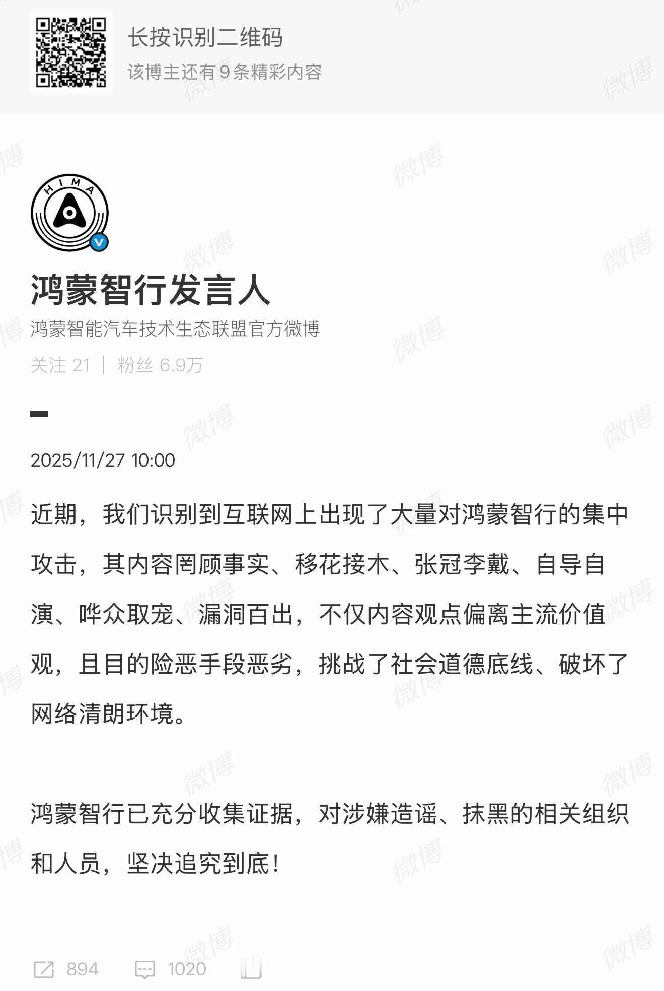 鸿蒙智行称已充分收集证据现在互联网上舆论已经跟 KOL 或者自媒体没啥关系了,因为大一点的号啥都不敢说,要不然就的被举报…所以主要的压力来自大量小号在各家老板、高管和官方账号下的评论。这种情况靠举报定向爆破是没什么用的,接下来就要看企业和监管部门的智慧了