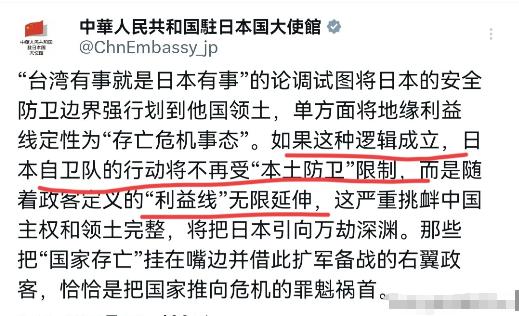 继续施压!高市早苗别想就此了事!11月27日,我们驻日大使馆发文表示,“台湾有事就是日本有事”的论调试图将日本的安全防卫边界强行划到他国领土,单方面将地缘利益线定性为“存亡危机事态”。如果这种逻辑成立,日本自卫队的行动将不再受“本土防卫”限制,而是随着政客定义的“利益线”无限延伸。   按照这个逻辑,只要日本政客单方面认定某个地区局势影响到所谓的“国家存亡”,自卫队就能随时跨出国门采取行动。   高市早苗最新表态中提到的“根据实际事态个别判断”,听起来像是留有余地的外交辞令,实则暗藏玄机。这种模糊表述等于给了右翼势力最大的操作空间——既不用明确定义触发条件,又能随时根据政治需要启动所谓的“存亡危机事态”。   这种危险游戏背后藏着日本军事扩张的野心。近年来日本不断突破专守防卫原则,军费开支连续创下新高,2023年度防卫预算更是达到惊人的6.8万亿日元。这些动作显然不是单纯为了本土防御,而是试图获得境外干预能力。   台湾问题作为中国内政,根本不容任何外部势力插手。日本某些政客却执意要在这个问题上玩火,甚至将距离本土干余公里的台湾海峡纳入所谓的“存亡危机事态”范围。这种跨越红线的行为,不仅违背中日四个政治文件原则,更是对国际关系基本准则的粗暴践踏。   从历史经验看,类似“利益线”扩张论调从来都是地区动荡的导火索。二战前日本军国主义正是通过不断重新定义“生命线”、“利益线”,逐步将侵略行为正当化。现在某些政客又开始操弄相同话术,不得不让人高度警惕。   日本国内其实也存在理性声音。多位资深外交人士曾私下表示,将台海局势与日本国家安全强行捆绑的做法极其冒险。一旦台海发生摩擦,日本是否介入、如何介入的决策权完全掌握在少数政客手中,这种缺乏制衡的机制很容易导致误判。   更值得关注的是美国因素在其中的作用。日本右翼势力敢于频频打出“台湾牌”,背后往往有美国的默许甚至怂恿。但历史教训表明,美国在关键时刻首先考虑的是自身利益,日本若盲目跟随战略,很可能沦为地缘政治博弈的牺牲品。   我国驻日大使馆的声明已经说得很明白,任何企图破坏中国主权和领土完整的行为都将引火烧身。中国维护国家统一的决心坚定不移,具备充分能力应对各种挑战。日本若执意跟随外部势力玩火,最终只会反噬自身。   高市早苗等人的表态也暴露出日本政治生态的深层问题。这些右翼政客通过炒作外部威胁来转移国内矛盾,试图用强硬外交姿态掩盖经济社会发展停滞的困境。但这种短视做法无异于饮鸩止渴,不仅无法解决实质问题,反而会加剧地区紧张。   从军事角度看,日本介入台海事务也缺乏现实基础。即便近年来军力有所增强,日本自卫队仍存在明显短板。远程投送能力不足、作战经验缺乏、装备体系依赖美国等问题,都制约其境外行动能力。真要冒险介入大国冲突,后果不堪设想。   经济层面的相互依存更是警示信号。中国长期是日本最大贸易伙伴,2023年双边贸易额超过3000亿美元。一旦关系恶化,日本汽车、电子、机械等支柱产业将遭受重创。这种损人不利己的冒险政策,显然不符合日本民众的根本利益。   国际社会对此也保持高度警觉。东南亚多国专家近期频频发声,担心日本的政策转向可能破坏地区稳定。澳大利亚前外交官甚至直言,日本某些政客的言论正在成为“自我实现的预言”,可能将整个亚太拖入安全困境。   我国在处理此类问题时始终保持着战略定力。既坚决反对任何形式的干涉内政,也始终敞开对话大门。这种既有原则又负责任的立场,与某些政客的冒险炒作形成鲜明对比。   需要认清的是,台海和平稳定符合各方共同利益。日本作为地理邻近国家,本应积极促进地区对话合作,而非跟随域外势力煽风点火。选择和平发展还是对抗冲突,这个答案其实不言自明。   对于高市早苗等人的危险言论,国际社会应当保持清醒认识。我国通过外交渠道持续施压非常必要,这既是对历史负责,也是对地区未来负责。任何企图颠覆战后国际秩序的行为都必须受到坚决制止。   现实情况很清楚,中国有充分信心和能力维护核心利益。某些政客的挑衅言论改变不了台海现状,也动摇不了国际社会普遍认同的一个中国原则。倒行逆施者终将明白,挑战中国主权红线的代价是他们无法承受的。   当前最需要的是回归理性与克制。日本政府应当约束国内右翼势力的冒险言行,避免被个别政客绑架国家政策。只有恪守中日四个政治文件原则,才能真正维护两国关系大局和地区和平稳定。