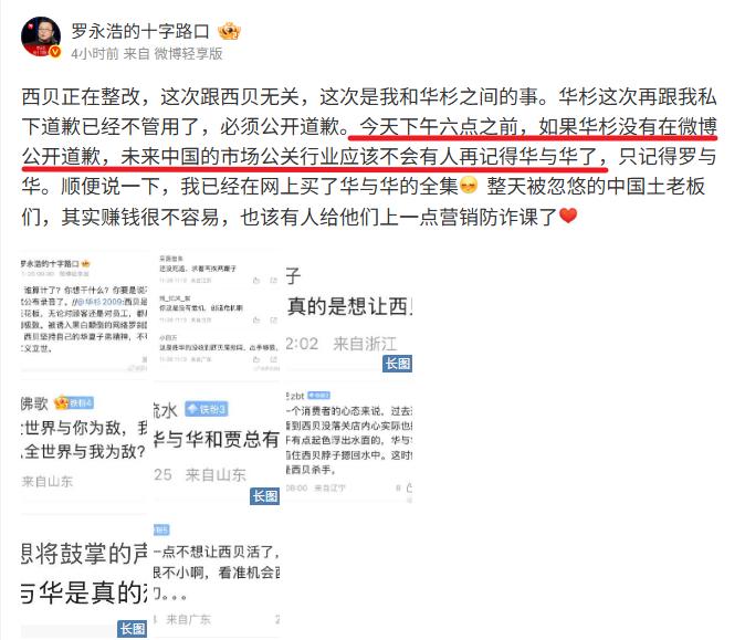 11月26日,罗永浩发布微博并置顶,要求华与华创始人华杉在今天下午6点之前公开道歉。 罗永浩在文中称:“西贝正在整改,这次跟西贝无关,这次是我和华杉之间的事。华杉这次再跟我私下道歉已经不管用了,必须公开道歉。今天下午六点之前,如果华杉没有在微博公开道歉, 未来中国的市场公关行业应该不会有人再记得华与华了,只记得罗与华。