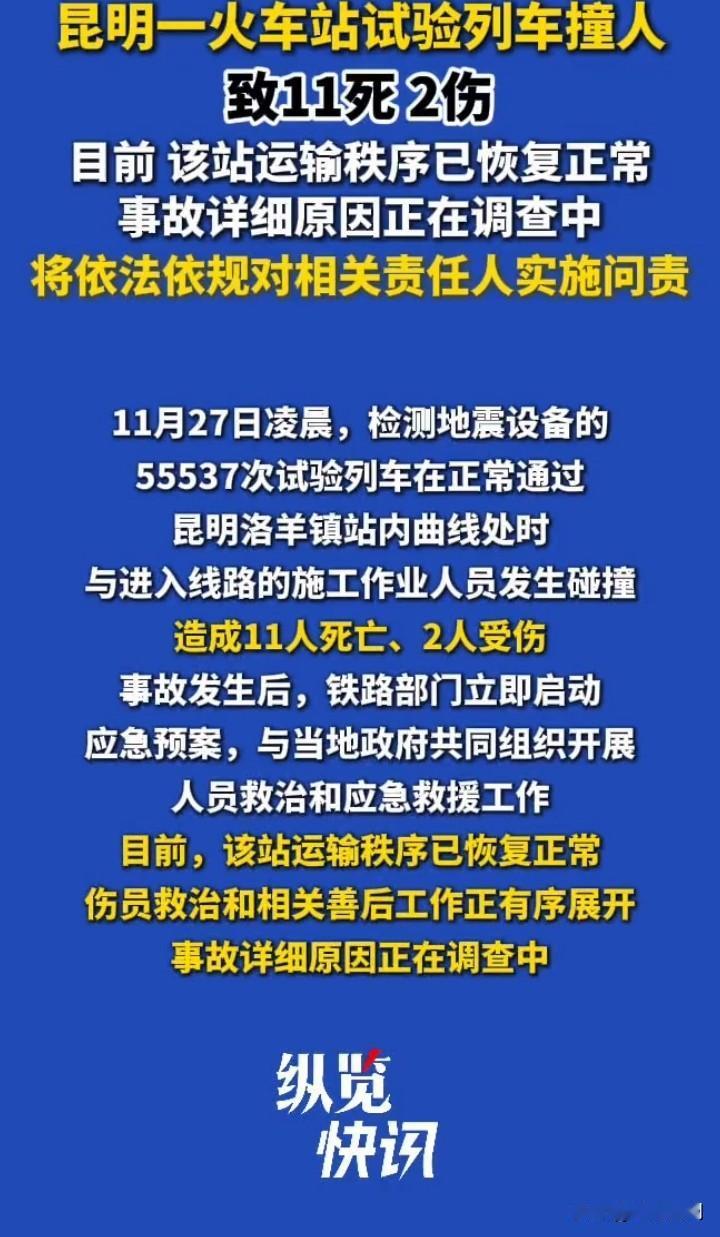 前有香港大火还没结束,内陆又出事故! 突发悲剧!昆明一试验列车撞死11人, 真的没法接受这样的悲剧!11个为生活奔波的普通人,凌晨还在岗位上忙碌,却突然遭遇不测,背后的家庭该有多崩溃啊。安全永远不该是“事后补救”,而是每一次协调、每一个流程里的底线,愿逝者安息,也盼所有户外作业者都能被好好保护,平安回家。