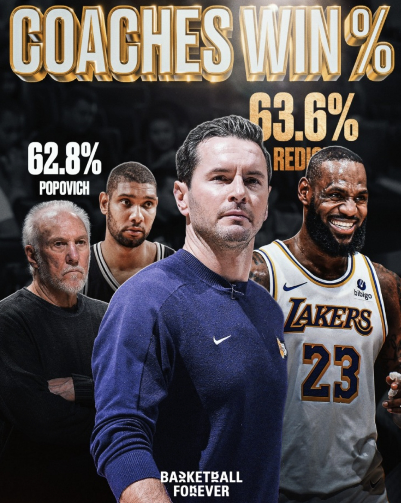 雷迪克目前执教了99场,战绩63胜36负,胜率63.6%,高于波波维奇的62.8%(1390胜824负);在雷迪克的带领下,湖人在前三节领先的情况下战绩为57胜4负,胜率93.4%,历史最佳!