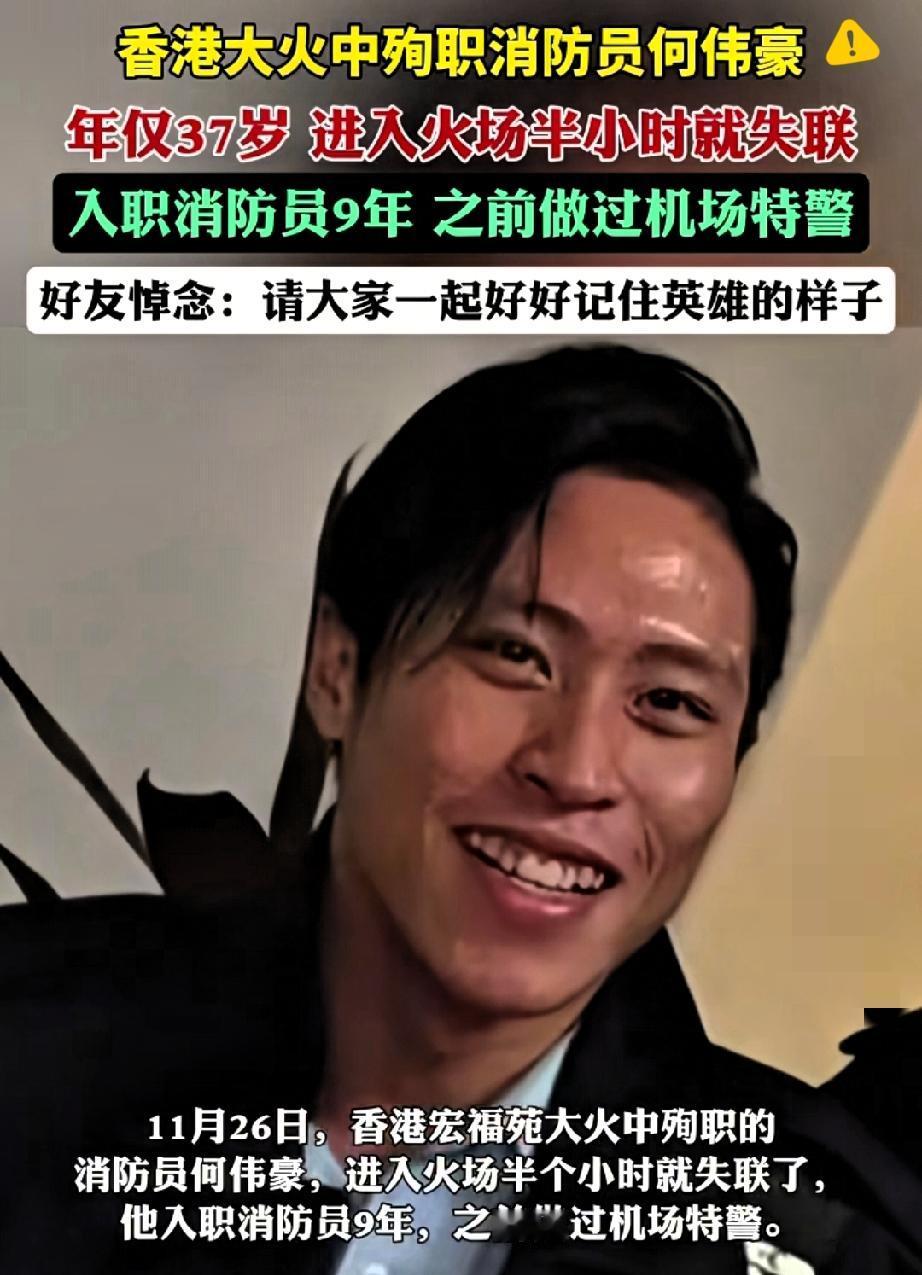 香港这场大火里,最戳心的从不是烧没的财物,而是那个再也没走出火场的37岁消防员何伟豪。 9年逆行路,他从没在警铃响起时犹豫过,几十斤的装备压在身上,冲向的却是别人拼了命要逃离的火海。 谁能想到,大埔宏福苑这一冲,就成了他和世界的告别,还有队友因热衰竭至今仍在抢救。 我们总把“岁月静好”挂在嘴边,却忘了这份安稳从来不是凭空来的—— 是有人把“守护”缝进制服,把危险挡在身前。 37岁的他,本该是爸妈的靠山、孩子的英雄,可一身藏蓝,让他选择了先护别人的家。 别再说“致敬”只是口号了,英雄不需要我们做什么惊天动地的事,只需要我们多一份细心:关紧煤气阀、拔好电源插头、不乱扔烟头。这些小事,对我们来说是习惯,对他们来说却是生的希望。 你平时会特意检查家里的消防安全隐患吗?还有哪些容易被忽略的防火细节,来评论区提醒更多人~