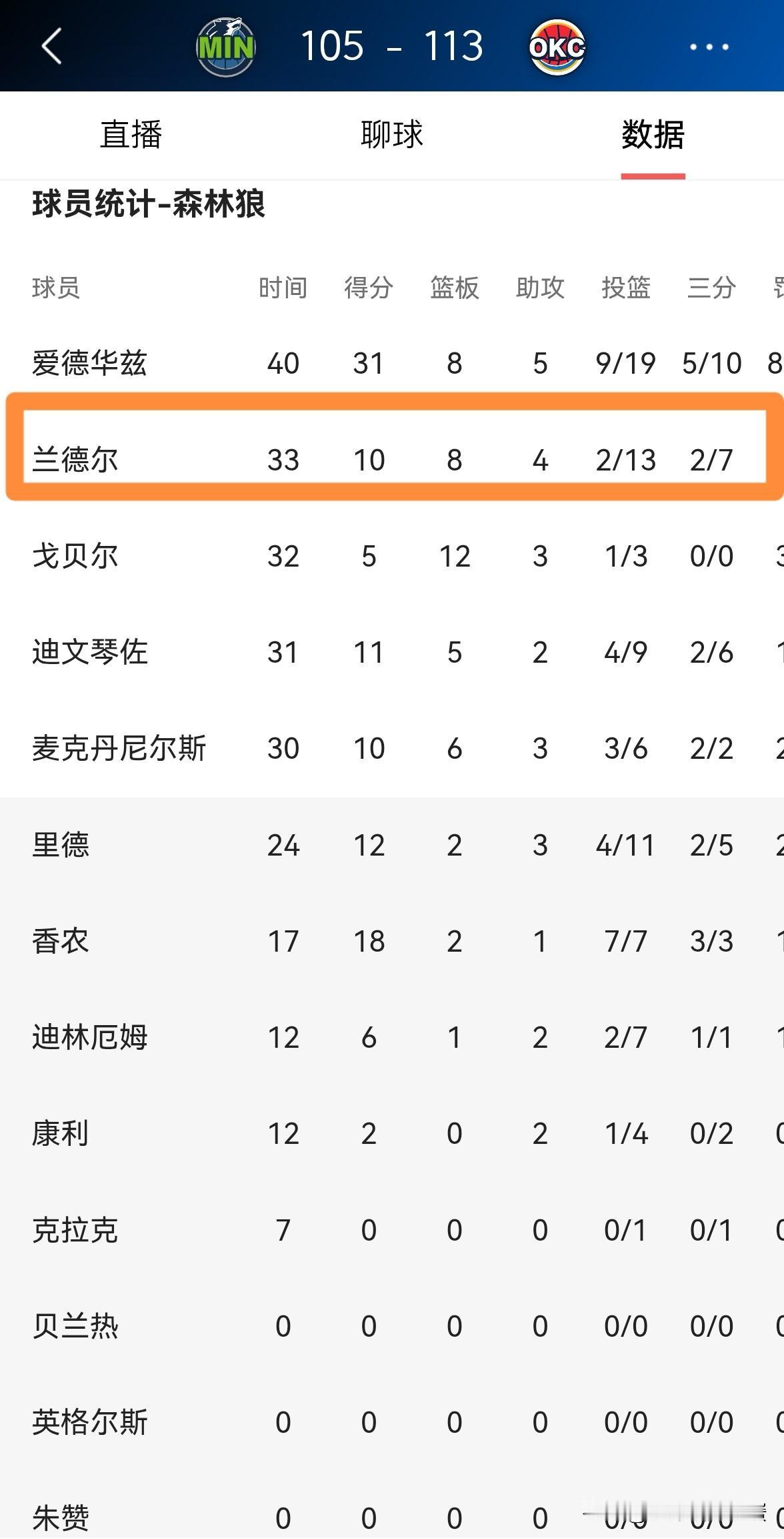 森林狼二当家兰德尔真是让人极度的失望!在今天森林狼客场以105:113输给雷霆的比赛中,兰德尔的表现真是糟糕极了,他是球队输球的罪魁祸首。 全场比赛下来,兰德尔首发出战33分钟,投篮13中2,其中三分球7中2、罚球7中4非常低效的得到10分,还出现了3次失误。 毫不夸张的说,本场比赛兰德尔的表现是完全失常的,他应该为球队的失利负主要责任。