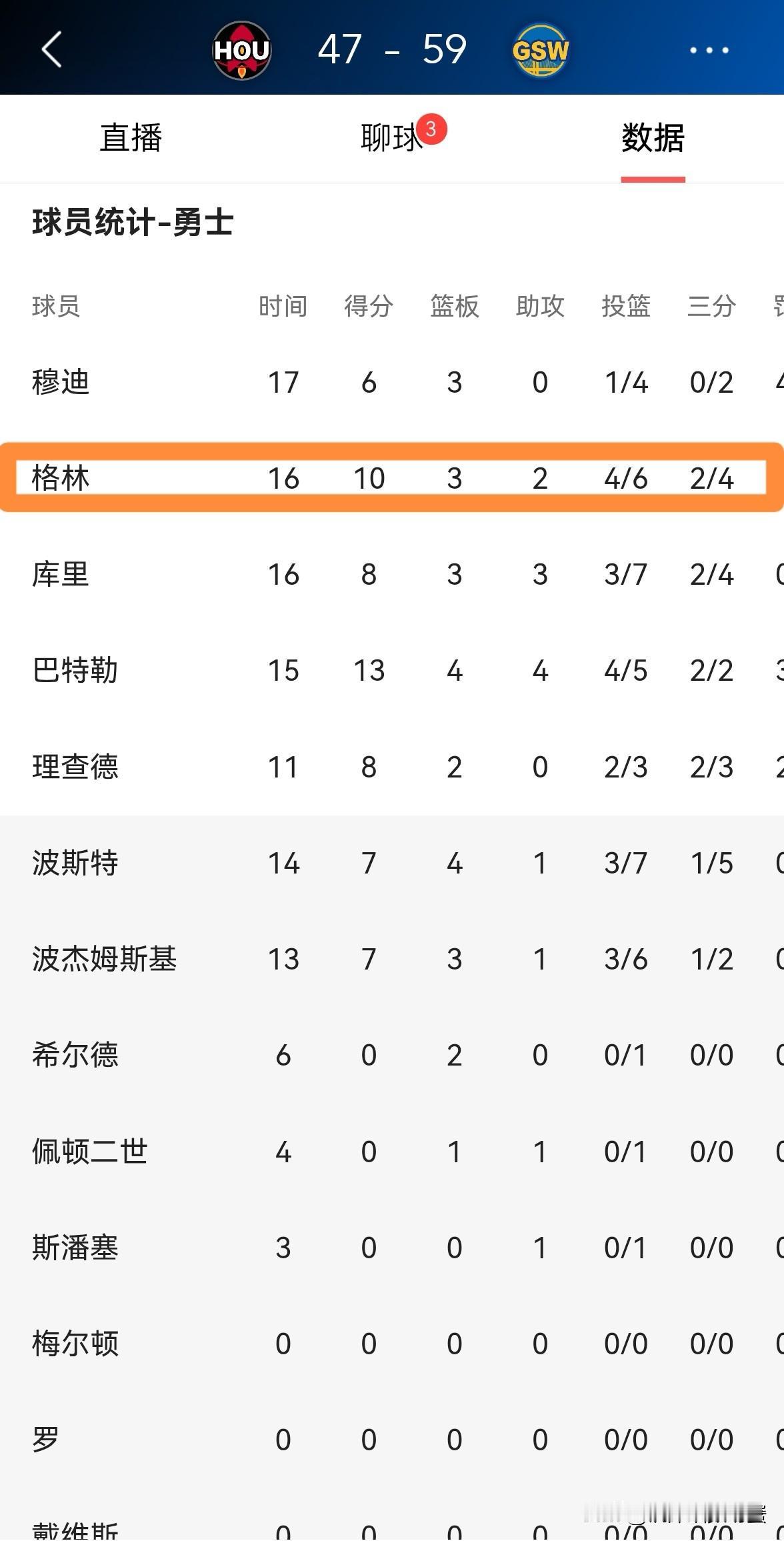 勇士老将追梦格林真是太让人意外了!在今天勇士主场迎战火箭的上半场比赛中,追梦格林一反常态竟然手感火热,他在首发出战的16分钟里,投篮6中4,其中三分球4中2非常高效的砍下10分3篮板2助攻1盖帽,他的场上正负值为全队最高的+16。 坦白说,今天的追梦格林真的让人大吃一惊,他怎么忽然之间投的这么准?