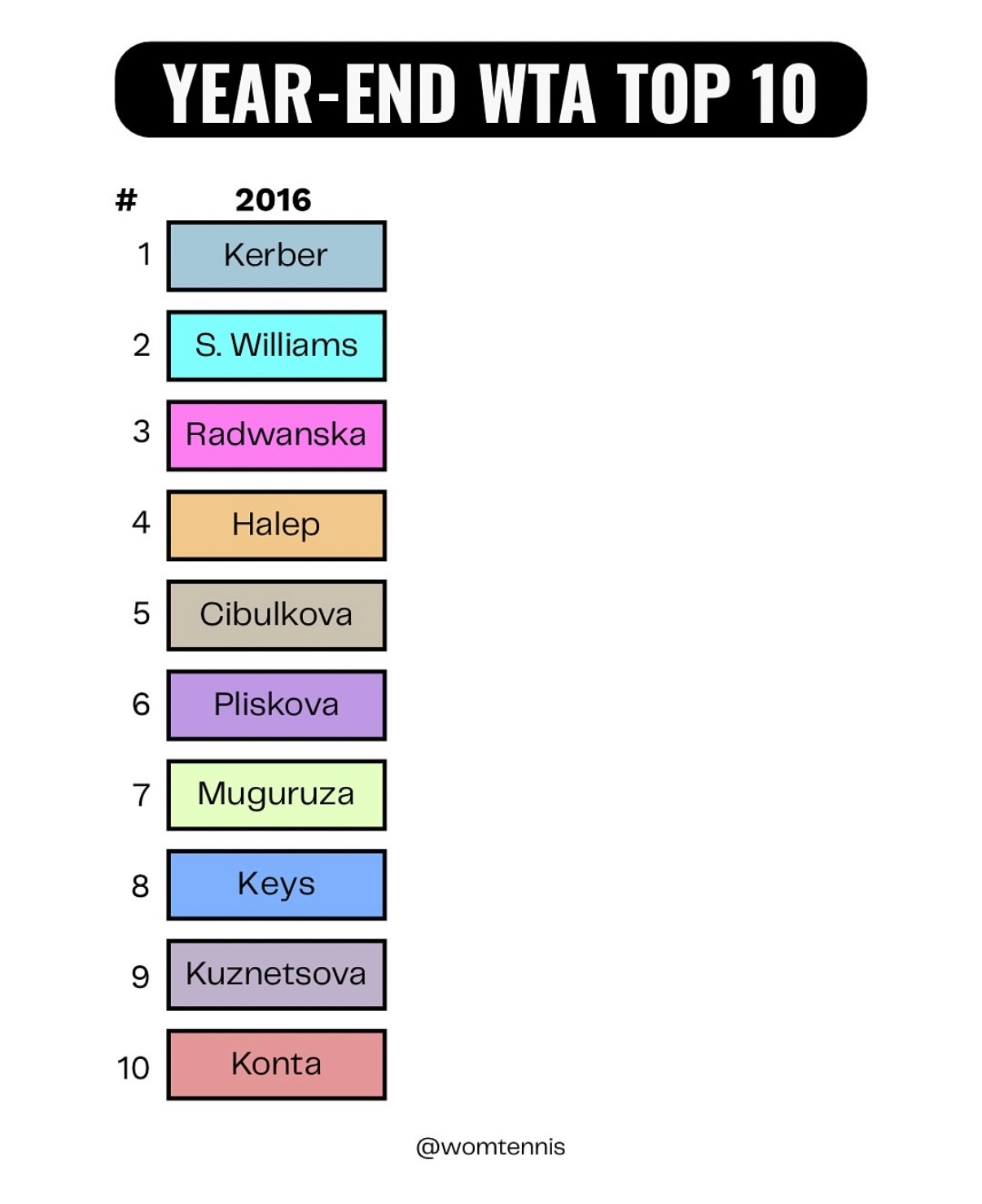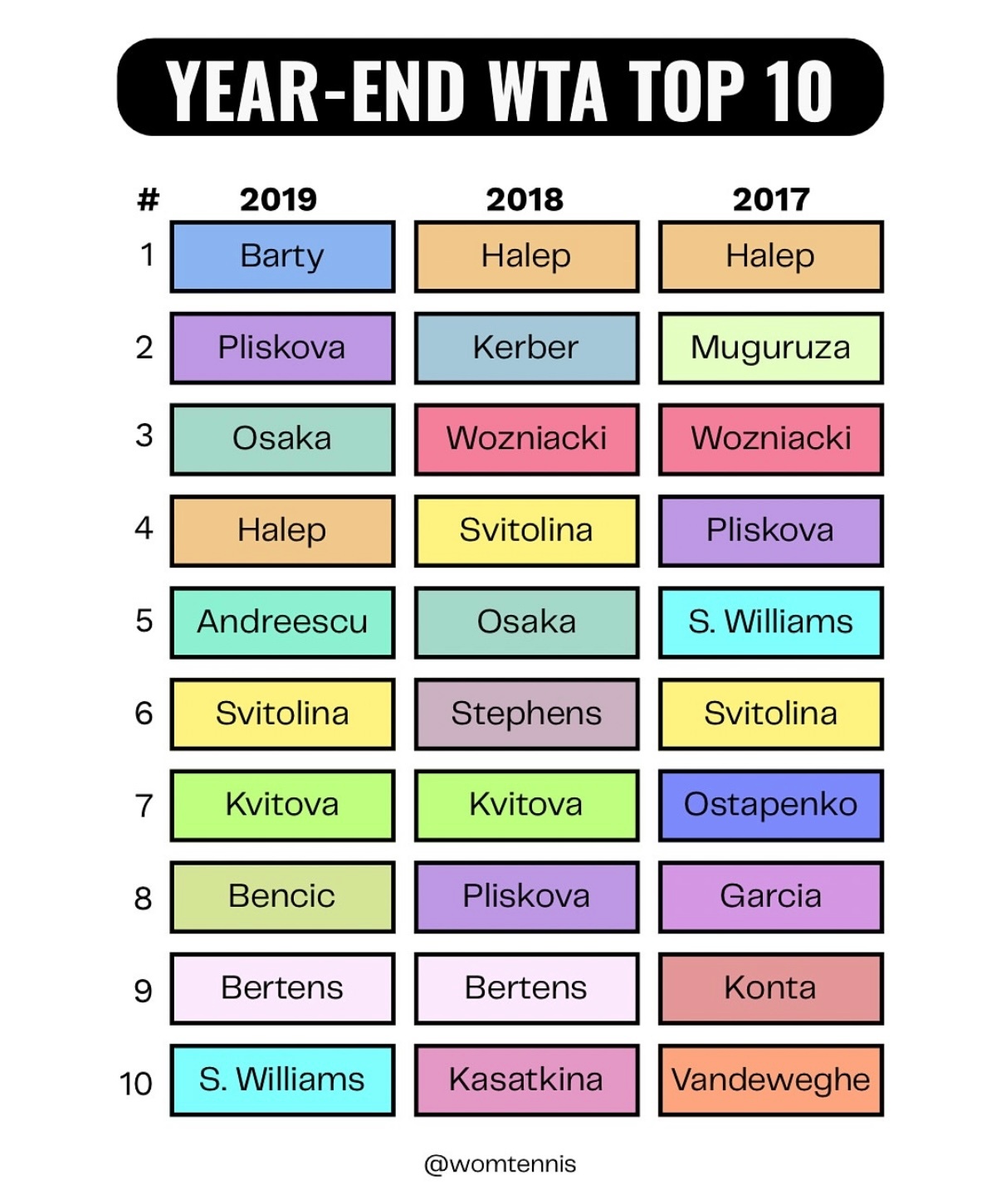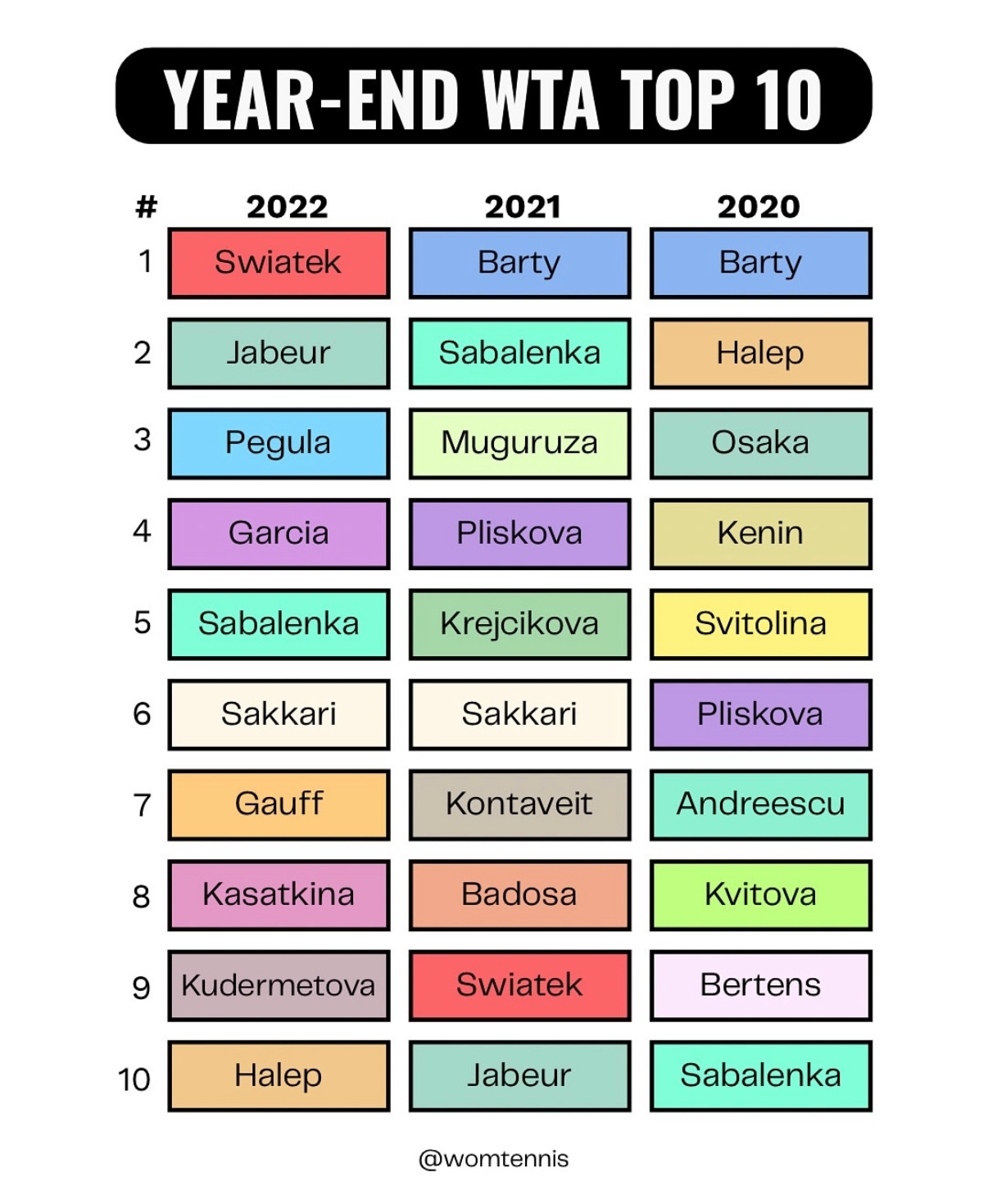 最近十年WTA年终TOP10一览:唯一连续六年出现的是萨巴伦卡,斯瓦泰克连续五年;最近九年年终NO.1都连庄过;高芙连续三年年终NO.3,三巨头守门员;五年前的TOP10已经隐退一半,这十年女网更新迭代速度还是挺快的。