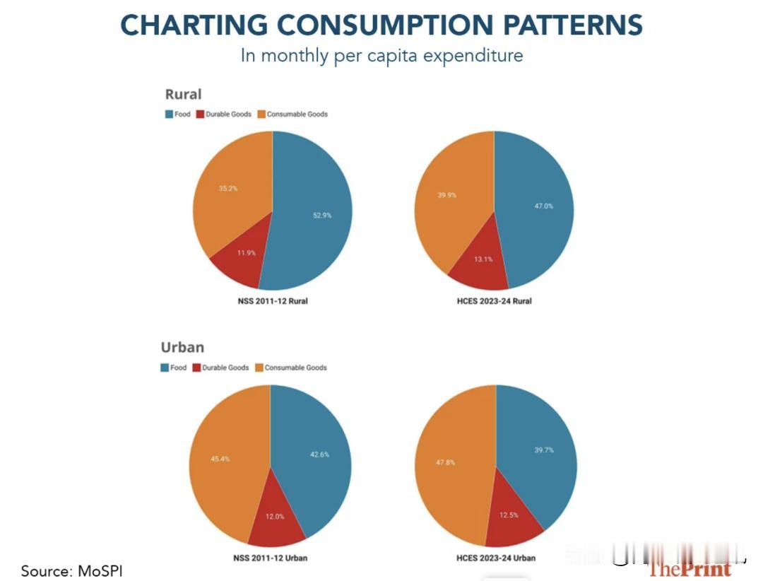 《印刷报》11月25日报道,印“总理-经济评估委员会”(PM-EAC)11月24日发布报告指出,印城乡消费差距正急剧缩小。机动车拥有率方面,当前印城乡家庭机动车(两轮车或汽车)拥有率均超半数。数据显示,农村地区机动车拥有率快速攀升,从2011-12年的19%增至2023-24年的59%,同期印城市家庭的机动车拥有率从40.1%增至68.2%。值得注意的是,印多数邦的城乡机动车拥有量趋同,而哈里亚纳邦、特伦甘纳邦、旁遮普邦的农村家庭机动车拥有量已超过城市家庭。据分析,印市场准入、道路基础设施、车辆融资渠道的改善,是印城乡地区机动车拥有率提升的主要动因。电视/移动手机拥有率方面,2023-24年城市地区的电视拥有率从2021-22年的80.4%降至78.5%,手机拥有率从92.2%增至97.7%,而同期农村的电视拥有率从49.6%增至61.1%,手机拥有率从77.6%增至96.5%。消费结构方面,印城乡家庭支出模式发生重大转变。印城乡月人均消费支出中食品占比首次降至50%以下,而在燃料、照明、医疗、教育等消费品以及耐用品上的支出占比均有所提升。报告指出,印城乡消费模式发生转变以及消费结构日趋多元化,表明印正向中等收入国家转型。