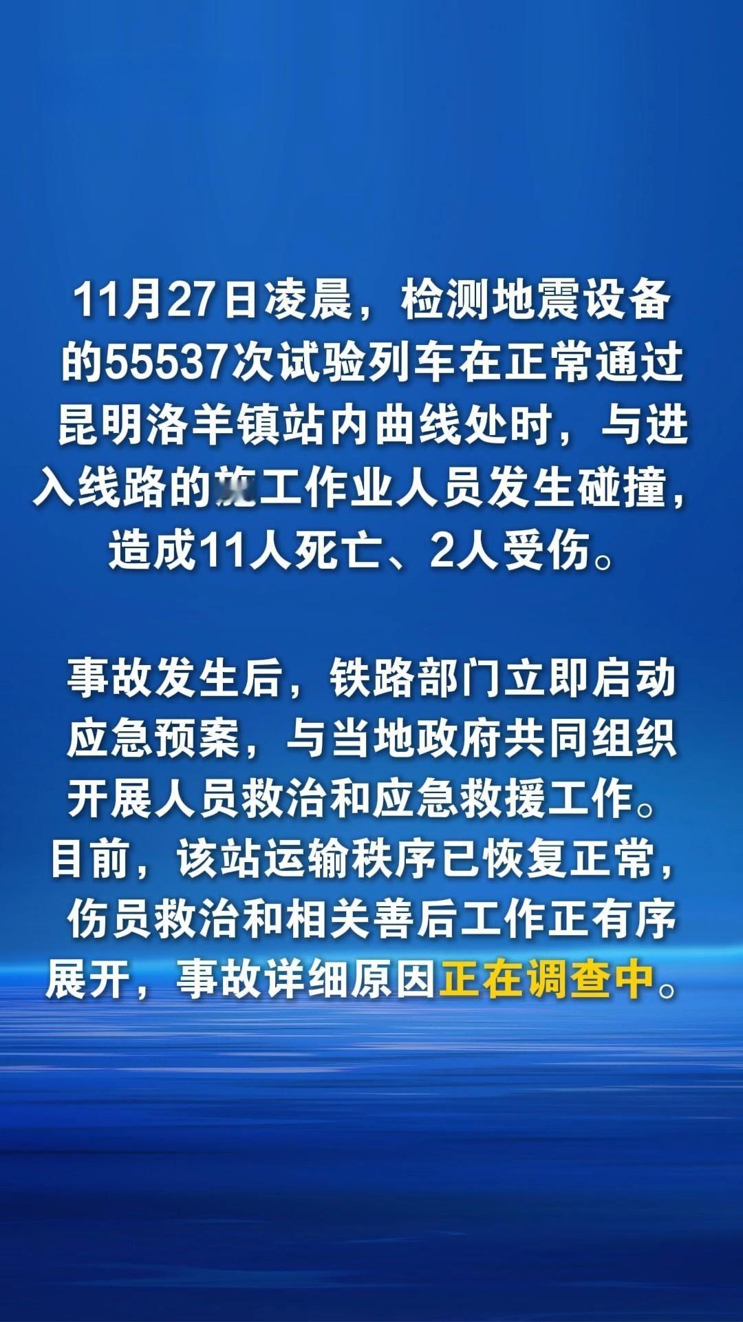 昨天香港,今天昆明, 这样的悲剧让人揪心! 一条原本用于检测地震的试验列车,竟在凌晨与施工作业人员发生碰撞,瞬间夺走11条生命、还造成2人受伤,这种“本可避免”的伤亡尤其令人痛心。 从通报看,事故发生在“站内曲线处”,列车是“正常通过”,但施工人员却“进入了线路”。 这暴露出施工组织与行车调度之间出现了致命的“信息断层”——要么是封锁命令没下达、要么是现场防护没落实、要么是作业人员未得到明确撤离通知。 无论哪一环失守,最终都指向同一个问题:没有把“人的生命”放在流程的最优先级! 这不是首次!多次这种事故频频发生。 技术进步提升了铁路安全系数,但人为因素仍是事故主因。 2021年6月 兰新线K596次列车撞施工人员事故。K596次旅客列车运行至兰新线时,因施工人员视线被故障捣固稳定车阻挡,未发现接近列车,造成9人死亡,3人已跨越线路,3人被阻拦幸免。 2024年6月 绥佳线货物列车撞施工人员事故 42109次货物列车在绥佳线汤原-望江区间,与侵入下行线的施工作业人员相撞,造成6人死亡(2人当场死亡,4人抢救无效死亡) 2016年12月 京广线安阳站列车撞人事故 X103次行包列车运行至安阳站166道岔区域,撞轧现场作业人员,造成6人死亡。 相关部门不仅要彻查事故原因、严肃追责,更要从根源上堵住安全漏洞,要真正护好每一位劳动者的生命。 愿伤者尽快脱离危险,愿逝者能被妥善告慰,更愿这样的意外永远不再发生!