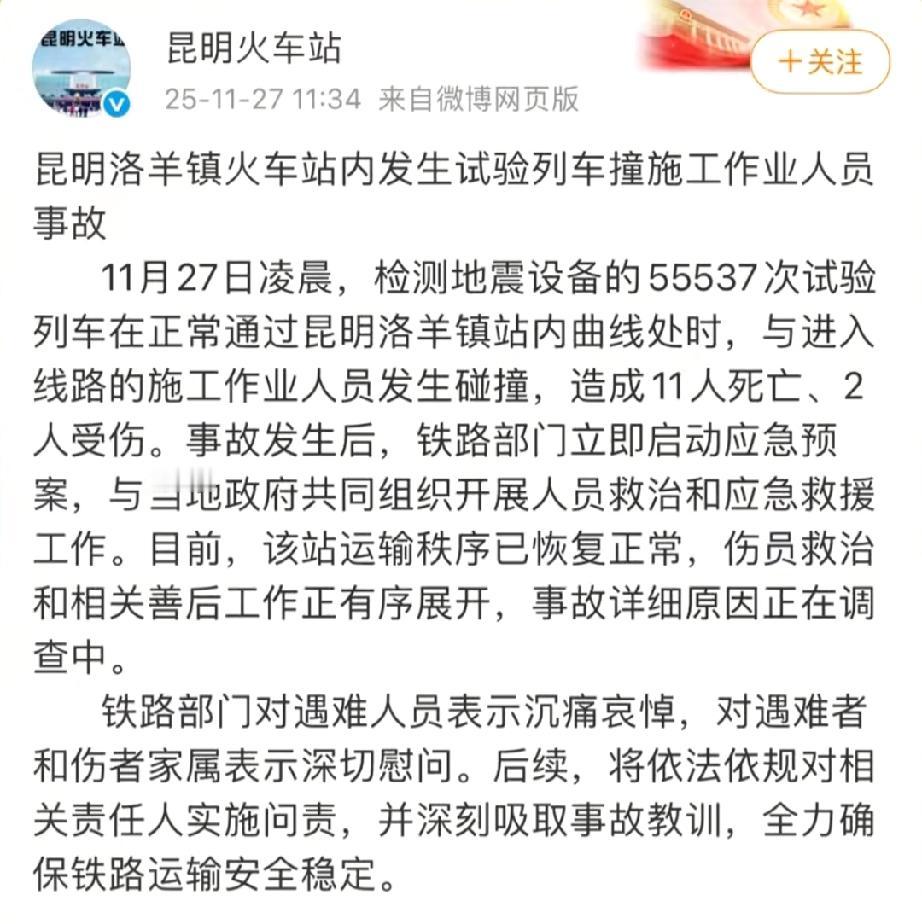 11月27日凌晨,昆明洛羊镇火车站被一场突如其来的悲剧笼罩,原本平静的站内瞬间被阴霾笼罩!当日,检测地震设备的55537次试验列车,在正常通过站内曲线处时,竟与闯入线路的施工作业人员猛烈相撞! 这场意外太过惨痛,造成11人不幸死亡、2人受伤。事故发生后,铁路部门反应迅速,第一时间启动应急预案,与当地政府紧密协作,全力开展人员救治和应急救援。目前,该站运输秩序已恢复正常,伤员正在积极救治,相关善后工作也有序推进。不过,这场悲剧的详细原因仍在调查中,希望相关部门能尽快查明真相,给逝者家属一个交代。