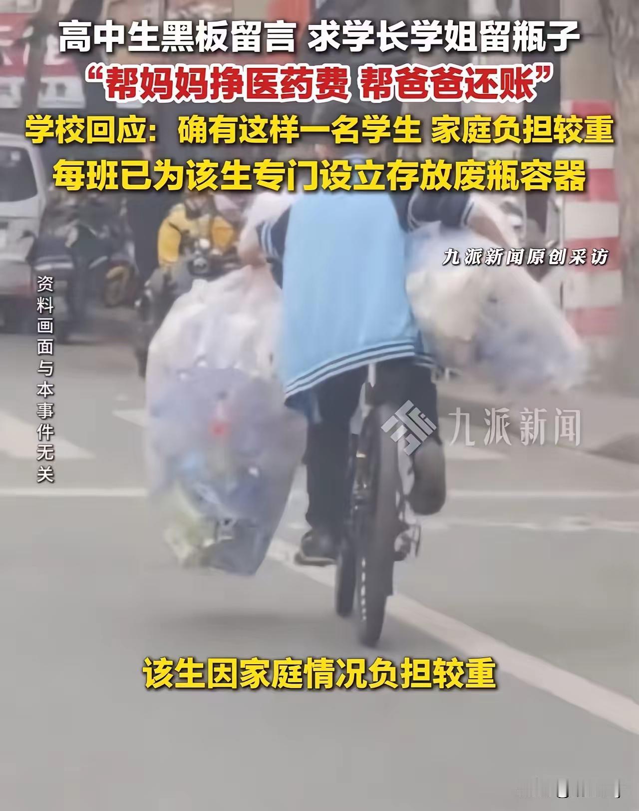看哭了!高二男生因家庭负债在学校黑板上留言:请学长学姐把喝完水的瓶子留给我,我想帮妈妈挣医药费,帮爸爸还债!他借钱给妈妈看病欠了十来万! ​男生很小心翼翼,他先写到“请学生会看到不要扣分……” 这男孩很懂事,不是嫌弃自己的父母,而是默默为家里做自己最大的帮助。这个年纪的孩子好多好面子,再困难都不会去捡瓶子的。 这样的孩子能扛重担,肯定将来是对社会有用的人,有担当的人。这样懂得感恩孝顺孩子才是国家应该补贴的,比起大把的真金白银补贴留学生,还嫌弃看不起我们,干嘛不拿来补贴这样懂得感恩的学生呢。 正如古人所言:“天将降大任于斯人也,必先苦其心志。”这个男孩的经历让人相信,经历过生活磨练的人,往往更能体会人间冷暖,更懂得感恩与回报。这样的年轻人,未来必将成为社会的栋梁之材。 这个故事也引发我们深思教育资源分配的问题。当一个品学兼优的学生因家庭经济困难而不得不分散精力维持生计时,社会是否应该给予更多关注与支持?与其将大量资源投向那些未必懂得感恩的领域,不如切实帮助这些在困境中依然努力向上的学子。因为投资在这样的年轻人身上,就是在投资我们这个社会的未来。