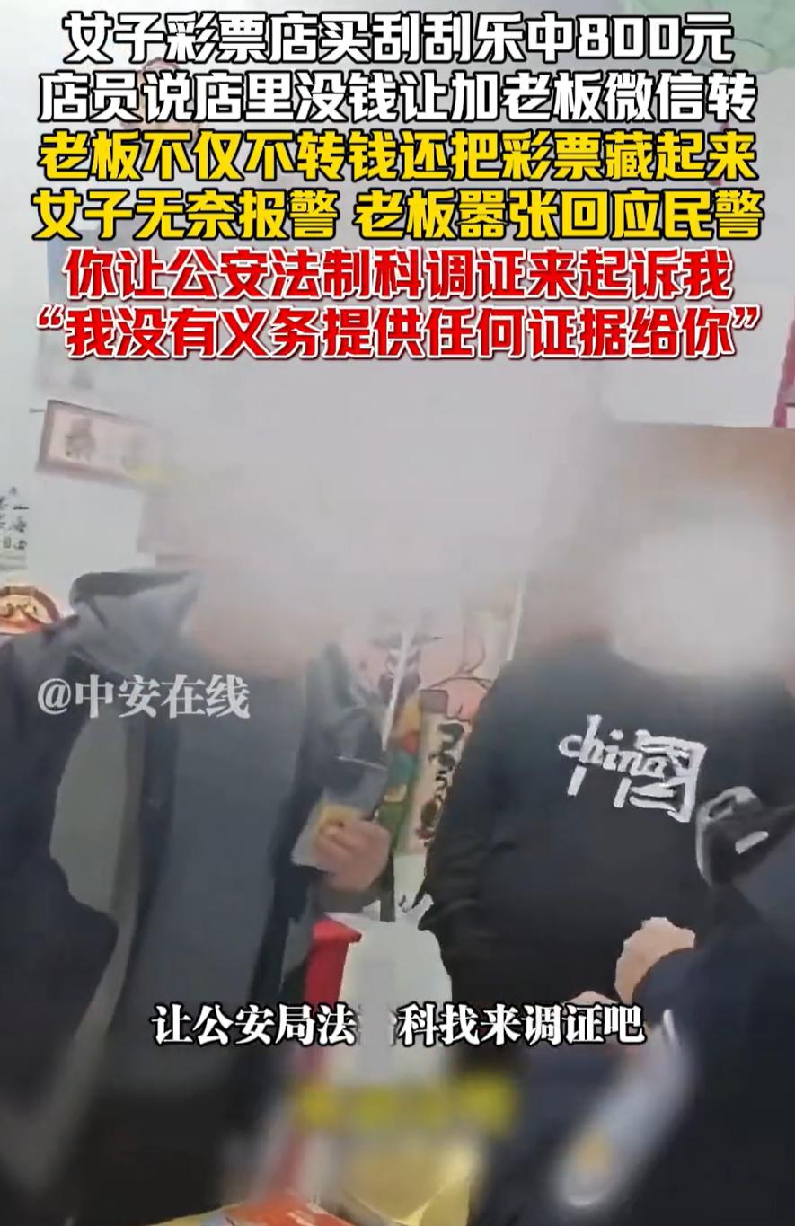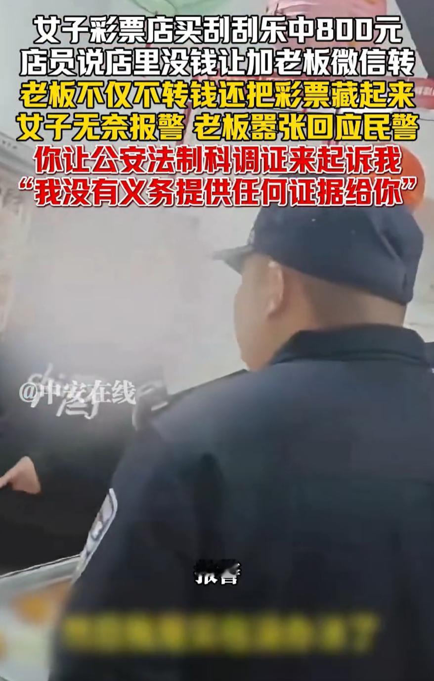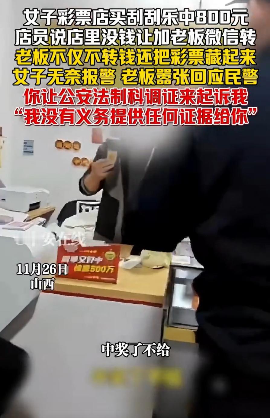 山西,一女子去彩票店买彩票,期间中了800块钱,可老板不但没有兑奖,还把彩票给藏了起来,女子一气之下选择报警,没想到,面对民警,老板依旧叫嚣:你让公安法制科调证来起诉我!网友:建议好好查查 女子介绍,当天她到彩票店买彩票,机选了10注双色球,扫码付了20块钱,随后她又要了一张刮刮乐,结果发现中了800块钱,给店里扫了20块钱,就要求店里兑奖 起初,店员说店里现在没有这么多钱,让女子加老板好友转账,女子也没多想就加了,可老板迟迟没有兑奖的意思,后来还把彩票藏起来,说她没有付款,所以这张不算 报警后,民警赶到现场,要求查看彩票,但老板依旧不肯拿出来,甚至一边拿手机拍摄,一边让法制科来起诉,他没有义务提供证据 事后,女子把这个事发到了网上 有网友说:一个正常营业的彩票站不至于为了八百块钱耍赖吧,这是正儿八经的捡了芝麻丢西瓜,真想不通 还有网友说:要么就是你没看好有隐藏符号不止800,要么就是他搞假票,800不至于,你去举报他这情况,他就封机了,所以只可能是二次票或者假票,兑不出来,把票藏了 说实话,如果真像网友说的那样,那就不是八百块的小纠纷了,性质马上就变味了 大家为什么会往那方面猜,其实不是无中生有,是因为老板的反应太反常。正常商家遇到这种事,哪怕不愿意兑,也会把票拿出来给民警看看,毕竟真是自己的理,没必要心虚。可偏偏他选择把票藏起来,又拒绝给警察看,还喊着让法制科来起诉。这种硬扛的姿态,本身就让外人觉得很奇怪 往大了说,这种行为影响的不是一张票,是行业的可信度。彩票本身就是建立在透明机制之上,一家店要是敢做这种动作,别人就会开始怀疑。所以说,这个事确实有必要好好查一下 对此,你有什么看法?