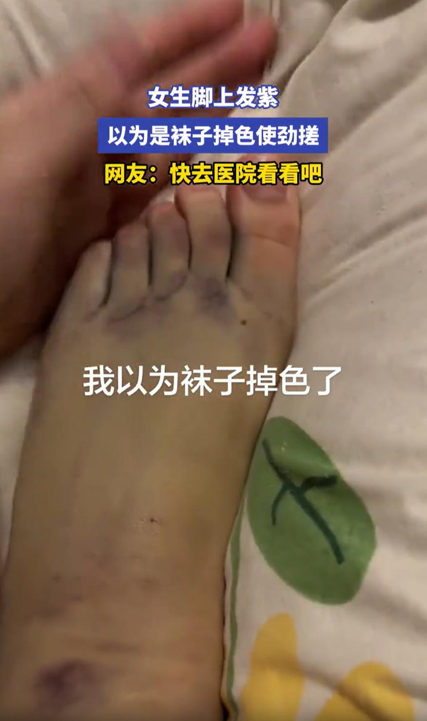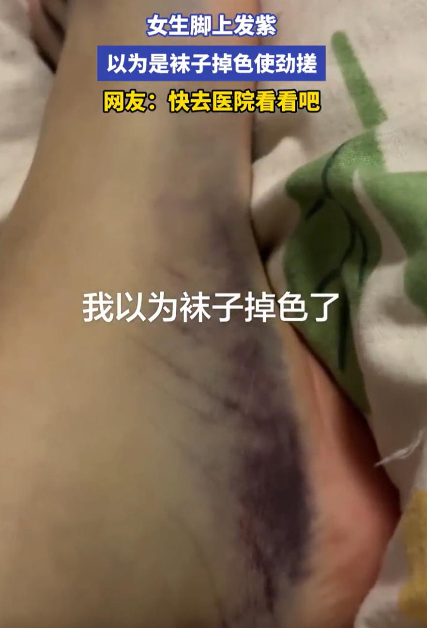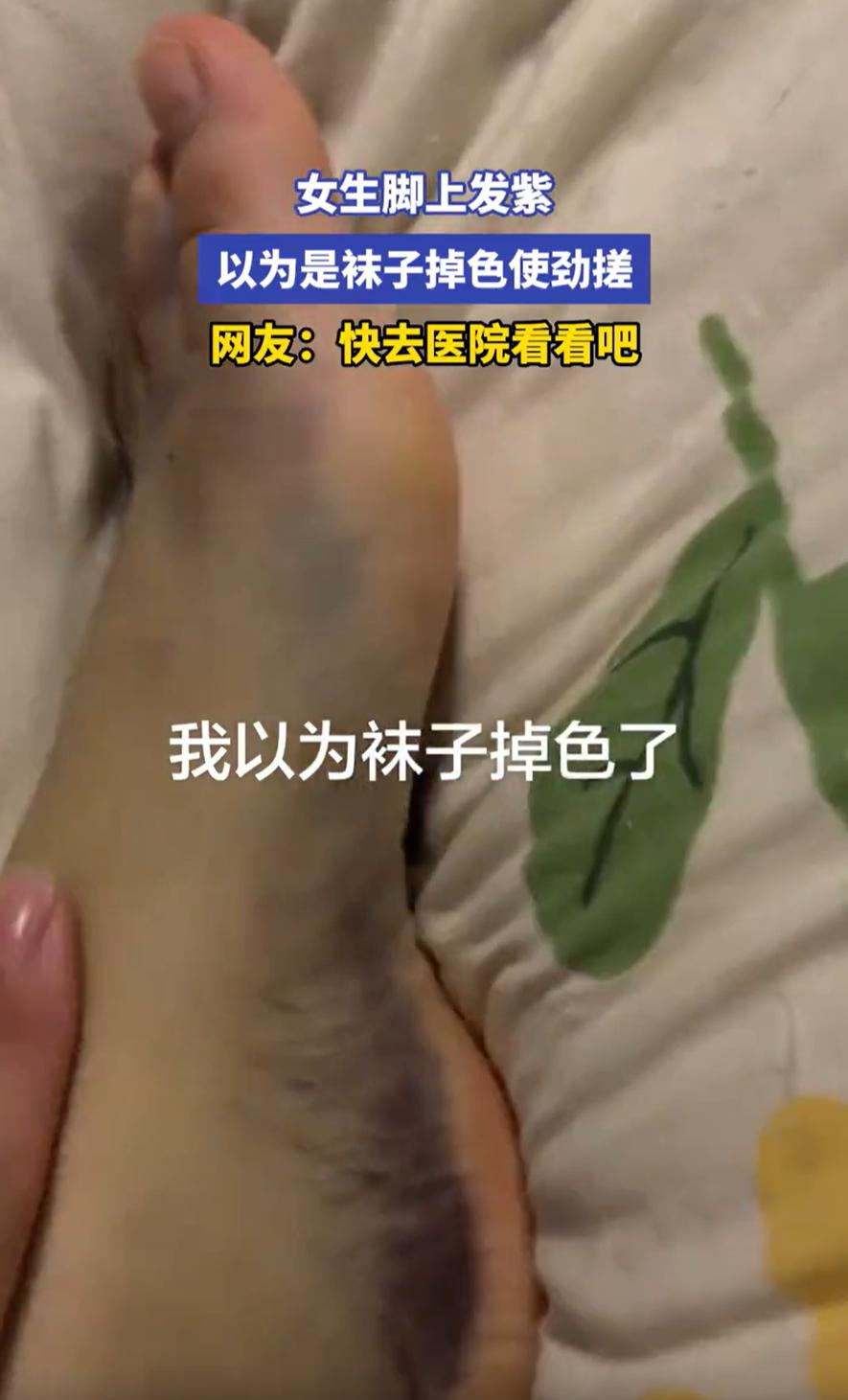 “这是啥情况?”女子回家后发现脚上发紫,开始还以为袜子掉色了,可不管她怎么搓,都没有效果,于是发视频求助,网友看到后表示:快去医院看看吧! 女子介绍,当天回到家后准备洗个澡,可脱掉袜子后就发现,脚的侧面和脚背的位置发紫,看上去就好像被墨水染色了一样,她第一反应就是袜子掉色了,可任凭她怎么搓,都没有任何变化,脚还是发紫 她本来没当回事,还拍了视频发上网,想问问大家有没有类似经历。没想到评论区一下子炸了锅,有人提醒她是不是崴过脚自己没注意,韧带拉伤有时候会这样显现;也有人严肃提醒,说这可能和血小板有关,劝她赶紧去医院检查 说实话,谁身上没突然出现过一两个淤青呢?大多数人会选择不管它,等它自己消退。但这次的情况不一样,不痛不肿,只是发紫,而且搓洗不去,这就超出了日常理解的范畴 我们身体偶尔会出现些信号,有些无关紧要,有些却值得留意。像这种不明原因的皮肤颜色改变,在医学上确实可能关联到多种情况:可能是局部血液循环的问题,也可能是轻微的皮下出血 网友们的建议是对的:遇到自己解释不了的身体变化,最好的选择是咨询专业医生。这不是小题大做,而是对自己负责