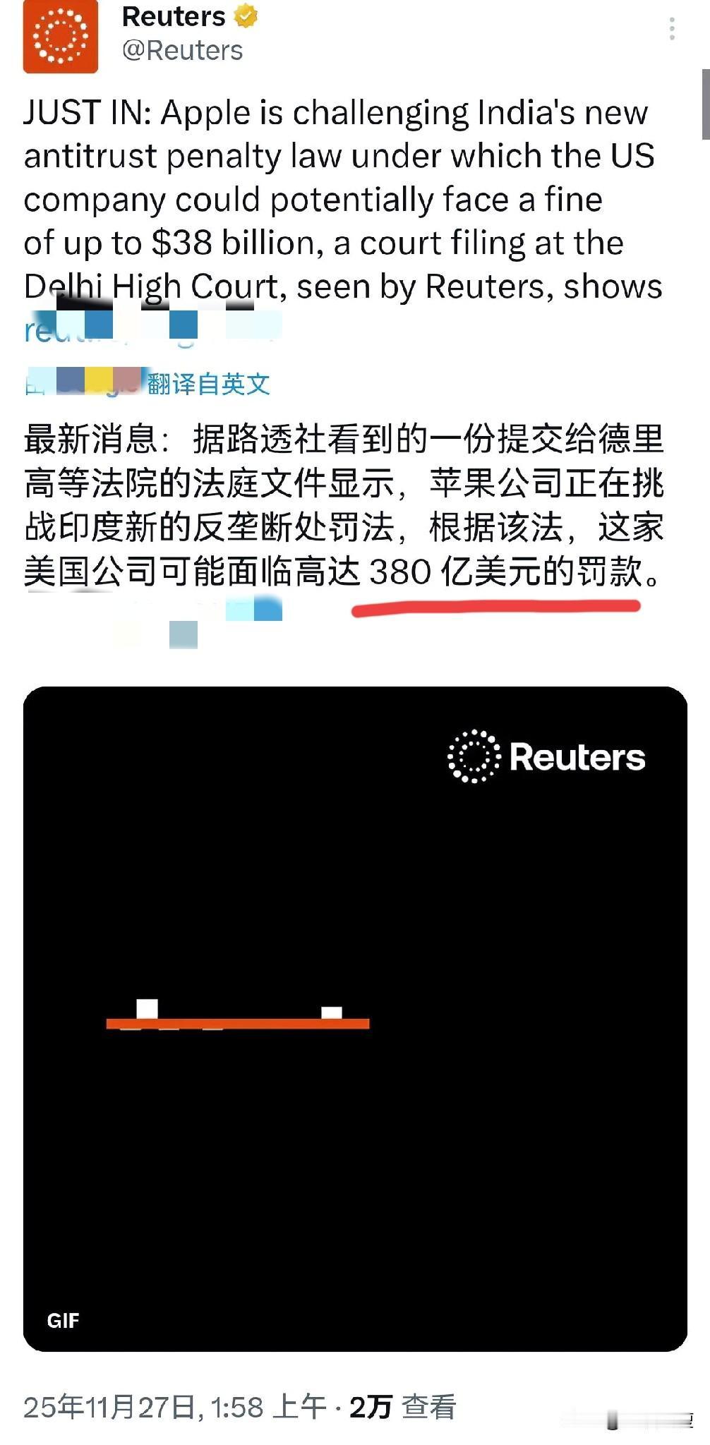 欢迎来到印度! 苹果无法忍受被层层盘剥,竟然选择拿起了法律的武器,反击印度。 事情起因是印度判苹果380亿美元反垄断罚款(呸,让苹果进印度时,他们难道认为印度市场有竞争者?),尽管印度还未做出最终裁决,苹果知道这把悬在头上的利剑随时可能落下。为什么是380亿?印度要求按照企业在全球的营业总额的10%来计算。 黑是真黑啊。当然苹果也没打算就范,他们准备逼印度修宪,去掉全球营业额10%的计算规则。可用这个模式,印度已经“款待”过不少外资企业了,他们真会让步,亦或这一切从最开始就是个局: 引诱你来投资﹣﹣等你建好工厂﹣﹣开始给你制造障碍﹣-用巨额罚款吓哭你﹣﹣你沮丧地缴纳罚款的大部分然后离开﹣﹣很快他们对下一家外资公司说:欢迎来到印度投资。