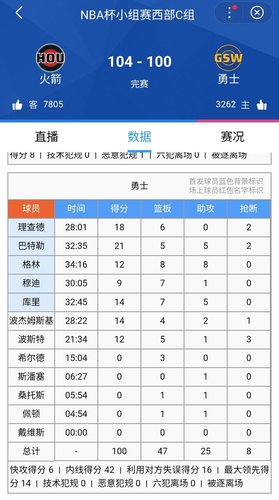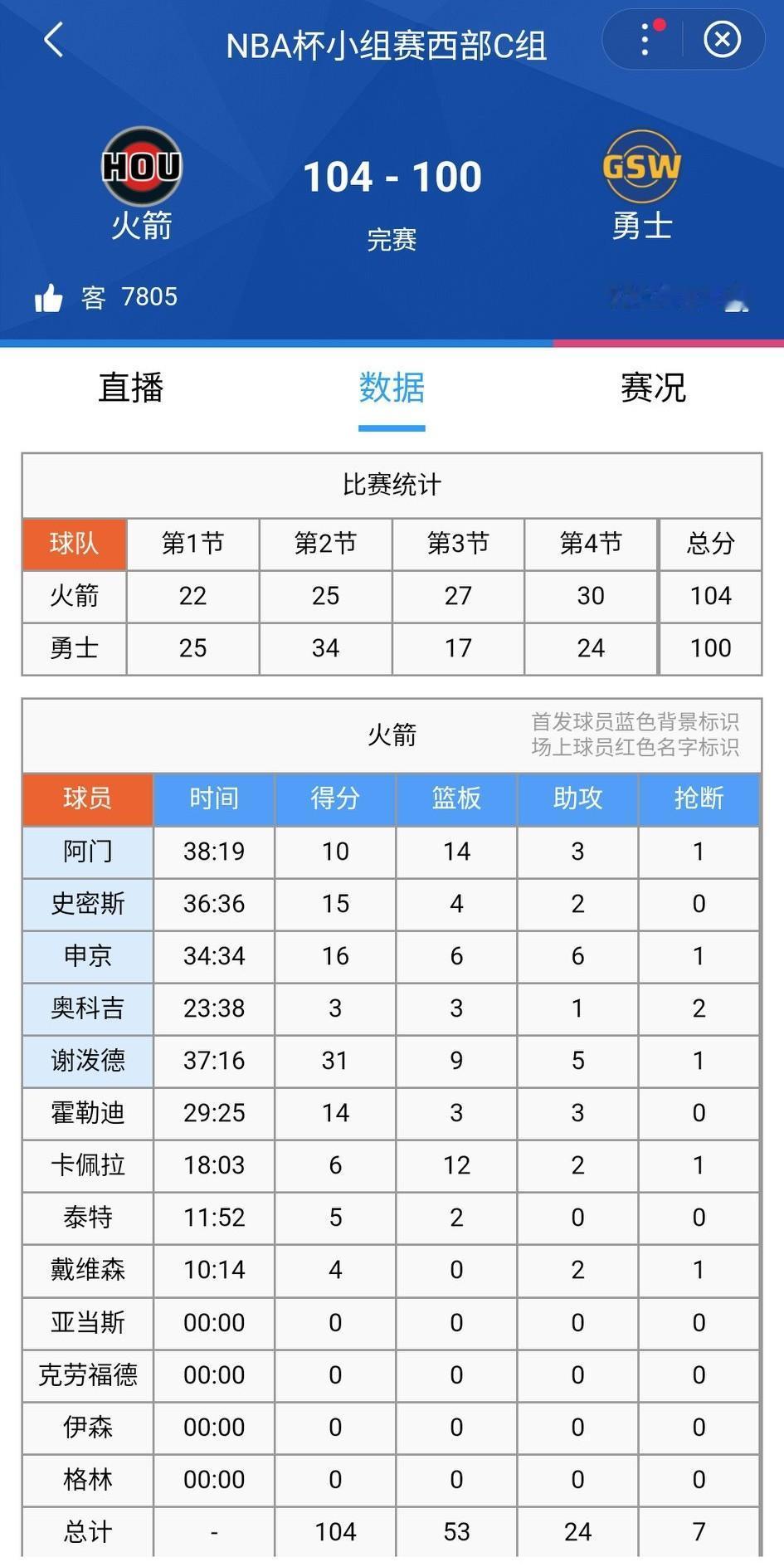 104-100!火箭用阿门防住了库里,果然顺利拿下勇士。库里13投仅4中,14分。谢泼德职业生涯得分新高31分。 上半场勇士全面开花,59-47领先火箭12分。 下半场火箭优势开始体现,尽管没有大杀器杜兰特,但打勇士还是绰绰有余。 最终火箭104-100逆转勇士。