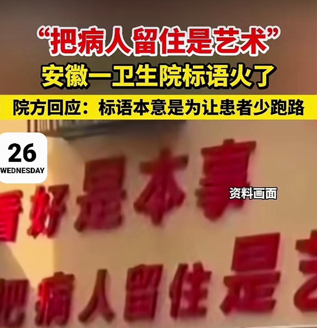 “看好是本事,把病人留住是艺术?”阜阳一处卫生院的标语火了! 网友调侃:咋滴,还想留我在院里过年啊? 这句挂在医疗机构墙上的话,刺痛的不仅仅是网友的幽默神经,更触及了一个我们不得不直面的核心问题:我们的健康,竟然成了需要被“艺术性留住”的客源? 说真的,我也是头一次见到把提高病床使用率说得那么清新脱俗的。 医疗的初心,是“留住病人”还是“治愈病人”? 把病人留住这五个字背后,又是一种怎样的价值导向? 一个理想的医疗体系,难道不应该追求让民众少生病,最大程度地减少与医院打交道的次数吗?可为什么这句话,却隐隐将“病人停留”视为一种值得追求的“艺术”? 这不得不让人怀疑,其背后的考核标准究竟是什么?当医疗的目标从“治愈”变成“留住”,我们还能否信任医生的每一个建议? 对于患者而言,最大的愿望就是“治好就走,再也不来”。医院又不是什么风景名胜区,干嘛要留住? 如果把“留住病人”奉为艺术,那么这是否会无形中鼓励小病大治,去延长不必要的住院时间? 我们不是怕被温暖的关怀留住,而是担心被一种隐形的商业化所“套牢”。仁术不该被“艺术”给取代。 自古以来,中国强调的是仁爱之心与精湛技术的统一。医患关系,本质是信托关系,是生命相托的信任。 也许这句标语的本意只是想强调人文关怀和医疗服务的温度,但一句能引发全民质疑的标语,正是因为它无意中戳破了某些医院过度市场化,以及公众对于医疗体系商业化的焦虑。 民众真正期待的,不是能把病人“留住”的医院,而是用负责的态度让人安心托付、健康离去的地方。 说真的,这句标语看着别扭,建议还是换了吧!大家觉得呢?