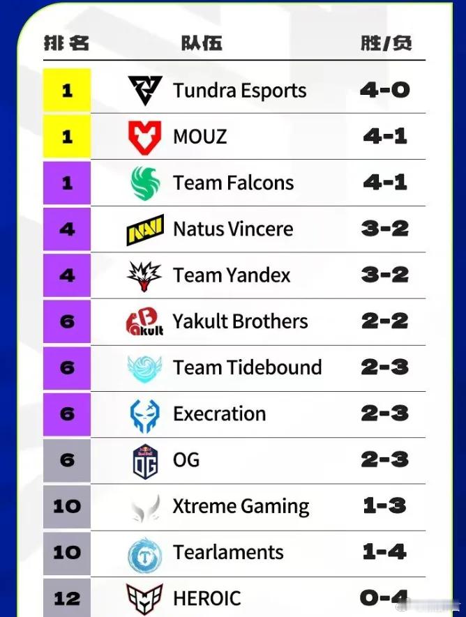 目前小组赛排名如下,YB是2-2,,战车2-3,XG是1-3,泪珠是1-4,不过这个小组赛是不淘汰人的,只是确认排名,给大家看一下赛制啊,就是小组赛前两名的队伍晋级半决赛,9-12名要打一个bo3,赢了的两个队伍去打Play-in,和3-8要打一个Bo3,赢了的晋级,输了淘汰,理论上就是你即使12名,连赢两个bo3也能去打线下dota2