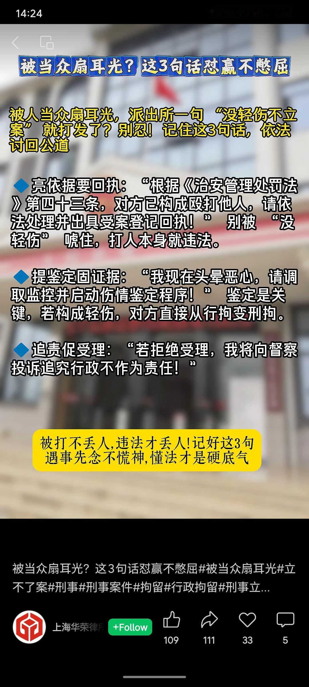 提供被当众扇耳光后的维权指导,建议运用三句话依法应对:要求警方依《治安管理处罚法》处理并出具回执;申请伤情鉴定固定证据;声明对不作为行为投诉追责,强调懂法维权。