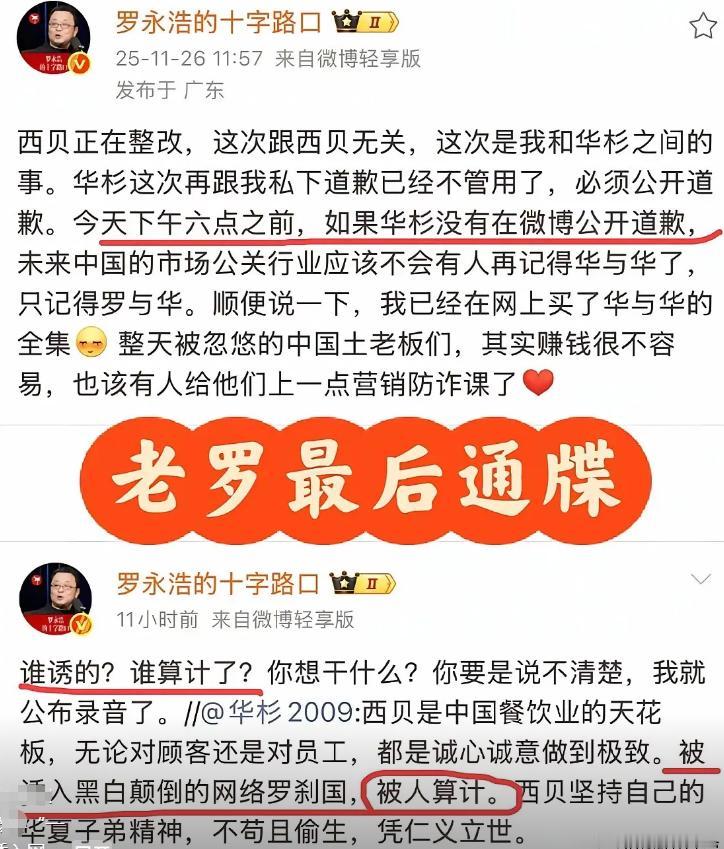不出意外,意外还是来了! 西贝9月份的预制菜风波刚过,现在11月份客流已经回稳了,没想到华与华又把西贝推到了风口浪尖。 前天华与华老板华杉发微博称西贝被诱入网络罗刹国,被人算计,一石激起千层浪,这话可惹怒了罗永浩,凌晨三点转发微博询问:谁诱的?谁算计了?你想干什么? 并放话要是华杉6点前不道歉将放出录音,让行业内只记得“罗与华”,不过这时候华与华也不是吓大的,马上开启了微博保护功能关闭了评论,到现在没有公开道歉。 现在大家都在说这件事情本来已经到此为止了,西贝又被自己人捅刀子,华杉是妥妥的猪队友啊,大家觉得是华杉有理还是罗永浩有理?你站哪边?