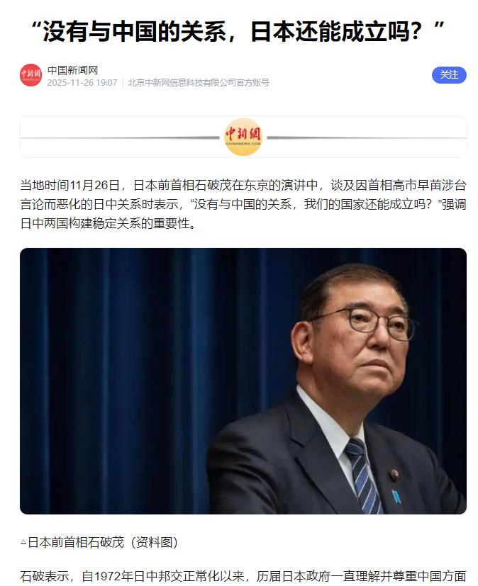 石破茂最新发声:没有跟中国的关系,世界或许上就没有日本这个国家! 这话是11月26日,日本前首相石破茂在东京讲话中说的,直接戳中了两国早已深度绑定的现实,不是靠政客几句强硬表态就能割裂的。 看看官方数据就知道,日本的经济命脉、产业发展,早就和中国绑在了一起。 从最基本的贸易格局来看,中国已经连续十几年是日本最大的贸易伙伴,2024年中日贸易总额还稳定在3082.74亿美元。 对日本来说,这可不是单纯的数字,而是实实在在的经济支撑。就拿日本的半导体巨头东京电子来说,2024年对华业务占比高达48%,中国连续两年都是它的第一大客户,全年销售额1.27万亿日元里,快一半都来自中国市场。 哪怕美国想施压收紧管制,这家企业也没法彻底撤出,2025年上半年对华业务占比还维持在40%,毕竟没人愿意丢掉这么大的市场。 不只是高科技产业,日本的中小企业更是把中国当成了“增长引擎”。第八届进博会上,148家日本企业组团参展,带来了270多种酒类、食品,就是看中了中国市场的潜力。 2025年前8个月,日本农林水产食品对华出口同比增长10%,中国早就成了日本清酒、烧酎这些特色产品的第一大出口目的地。 这些中小企业不像大企业有能力布局全球,中国市场的好坏直接关系到它们的生死,要是合作断了,很多小厂家可能直接倒闭。 日本的汽车产业更是深陷“离不开中国”的困境。虽然2024年日系车企在华销量下滑,市场份额降到11.2%,但中国依然是全球最大的汽车市场,更是新能源汽车的核心赛场。 丰田、本田、日产想转型电动化,根本绕不开中国的技术和供应链,中国的电池技术、智能驾驶系统都是行业领先,而且中国市场的规模能摊薄研发成本。 日产关闭常州工厂、本田关停广州工厂,看似在收缩,实则是想调整策略保住中国市场,毕竟要是彻底退出,不仅会丢掉巨额营收,还会错失电动化转型的关键机遇。 更深远的是,两国的绑定早就超出了单纯的买卖关系。从RCEP全面生效到263对地方友城的务实合作,从当年日元贷款建设的兖州-石白所铁路、秦皇岛港,到现在的银发经济、跨境电商合作,中日经济已经形成了“你中有我、我中有你”的格局。 日本贸易振兴机构都坦言,因为关系紧张,二十余项对华合作活动被取消,这不仅让企业受损,更让两国民间互信和合作基础受影响。 中方一直说得很清楚,台湾问题是中国内政,绝不允许日本插手,毛宁发言人的表态已经把底线划得明明白白。 石破茂的反问,本质上是提醒日本政客:国家发展不能靠意识形态绑架,更不能拿国民的生计当赌注。 中国不是日本的“对手”,而是无法替代的合作伙伴,不管是东京电子的设备订单,还是中小企业的食品出口,或是车企的电动化转型,都离不开中国市场的支撑。 这种深度绑定不是一朝一夕形成的,也不是靠几句激进言论就能割裂的。 中日两国一衣带水,顺应RCEP带来的合作机遇,守住一个中国原则的底线,深化贸易、产业、地方层面的务实合作,才是对两国人民负责的选择。 毕竟,真正的国家实力,不是靠挑衅刷存在感,而是让企业能盈利、民众能受益、经济能稳定发展,这一点,石破茂看得很清楚,希望日本的政客们也能早日清醒过来。