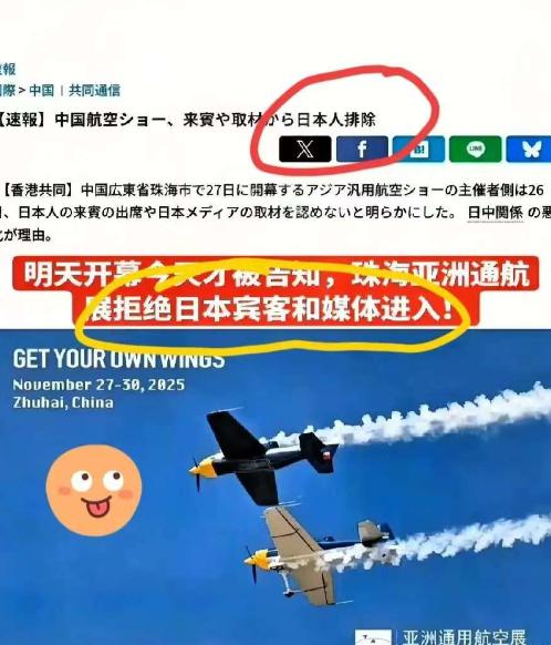 就在刚刚 大快人心吖! 日本共同社刚报道,11月27号珠海亚洲通用航空展的一则通知引发全网关注:日本嘉宾及媒体被明确拒绝参会,即便已拿到采访许可证的日媒,也收到了许可证作废的通知。 这场被日本共同社称为“意外”的决定,背后是高市早苗政府上台以来不断触碰中国底线的连锁反应——从教科书删除侵略史实,到2025年4月72名议员集体参拜靖国神社,从计划将防卫预算提至GDP2%,到首相公开宣称“要让日本为历史自豪”,这些动作早已突破中日关系的政治基础。 熟悉中日关系的人都知道,珠海航展并非普通商业展会。作为全球五大航展中唯一由政府和军队联合主办的平台,它既是中国航空航天技术的展示窗,也是国防政策的风向标。 2024年航展成交近2856亿元,吸引59万人参观,日本企业过去常以精密部件供应商身份参与。 但今年的拒绝,本质上是对日本拒不承认战后秩序的“技术断交”。 想想看,当日本教科书把“侵略华北”改成“进出华北”,把南京大屠杀称为“事件”,甚至在2025年新版教材中80%内容弱化罪责时,中国怎么可能在象征国家科技实力的场合,允许否认历史的国家近距离观察歼-20改进型、彩虹-7无人机等核心装备? 更关键的是,日本对中国的挑衅已从历史领域延伸至现实安全。2023年防卫预算破GDP1%,2025年新首相直接瞄准和平宪法第九条,计划将自卫队升级为国防军,这种突破战后秩序的行为,与珠海航展“展示国防现代化”的定位形成直接对冲。 就像2014年《人民日报》强调的,日本必须遵守《波茨坦公告》,但现在他们连苏联对日宣战的正当性都要否定,等于在否定整个二战结果。这种情况下,中国在自家门口的航展划出红线,既是维护历史正义,也是筑牢安全防线。 日本媒体抱怨“手续齐全却被作废”,却选择性忽视一个事实:2021年他们强删教科书“随军慰安妇”内容时,可曾想过受害者的公道?2025年4月议员参拜靖国神社时,可曾考虑过中国人民的感情? 珠海航展的拒绝,本质上是对日本“历史修正主义+军事扩张”双轨策略的反制。 正如德国在战后通过真诚忏悔赢得信任,日本却选择改教科书、拜战犯、扩军备,这种背道而驰的路径,必然导致其在国际舞台上的孤立。 从技术层面看,日本缺席航展的损失远超表面。中国稀土出口管制后,日本85%的镓、锗依赖受冲击,而珠海航展上的无人机、导弹系统恰恰是这些资源的重要应用领域。 更讽刺的是,日本网友在社交媒体承认“中日技术差距越拉越大”,有人直言“中国靠自己,日本靠美国,永远追不上”。这种民间清醒与政府装傻的对比,恰恰暴露了日本的结构性矛盾:一方面想借美国遏制中国,另一方面又舍不得中国市场和技术合作。 但中国的态度很明确:历史问题没有模糊空间,核心利益不容讨价还价。珠海航展不是第一次对不当行径说“不”,2010年某国政要涉华言论后,也曾有企业被取消参展资格。 这次针对日本的全面拒绝,释放的信号更清晰:任何试图否定侵略历史、挑战战后秩序的行为,都将付出代价。 正如扎哈罗娃提醒的,中国做好心理准备,不是要挑起对抗,而是让历史不再重演。当日本政府还在幻想“等受害者死光”时,中国用实际行动证明:有些底线,永远不能退。 这场航展禁令,说白了是中国对日本“改史强军”组合拳的精准反制。从教科书到靖国神社,从防卫预算到宪法修改,日本的每一步都在试探中国的容忍度。 珠海航展的“关门”,既是对历史的交代,也是对现实的警示——14年抗战的血不能白流,3500万同胞的牺牲必须被铭记。 当日本政客还在为“终战”还是“战败”玩文字游戏时,中国用一场航展的拒绝,让世界看清:谁在守护历史真相,谁在试图篡改未来。