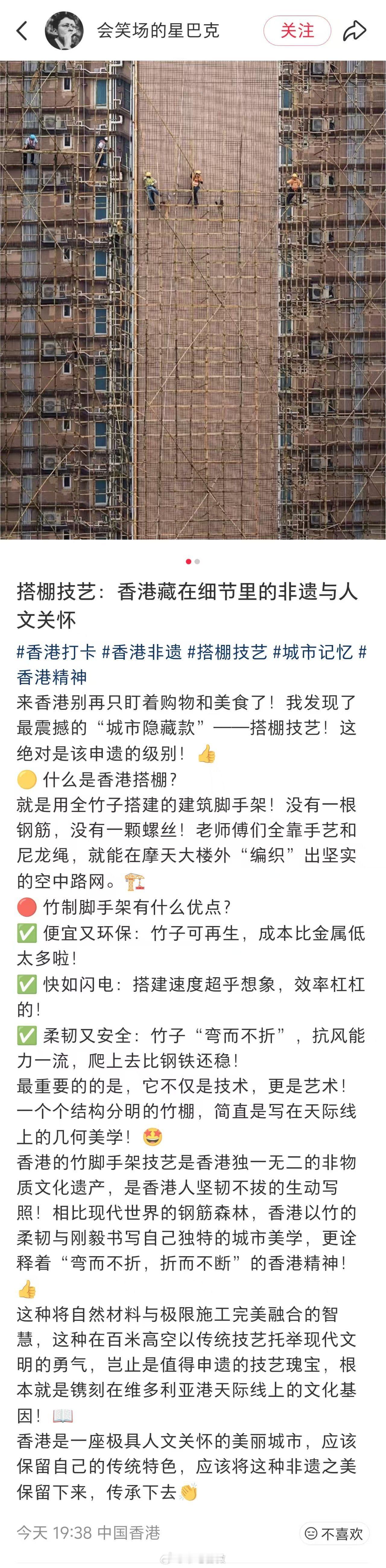 竹子脚手架,三层以下建筑用用尚存危险,那种超过三层甚至四五十层高楼还在用的,明显就是危险施工了,就不要吹什么“非遗技艺与人文关怀”了。真正的人文关怀首先得是保障人身安全,事关安全的东西还是得与时俱进。这次香港大埔宏福苑火灾,要是用钢制脚手架、用上阻燃外围安全网,必然会大大减少伤亡与损失。⭐希望香港的相关协会和“专家”不要到处甩锅了,多从自己身上找问题吧!香港火灾别让归因争议掩盖重要话题香港火灾已有55人遇难