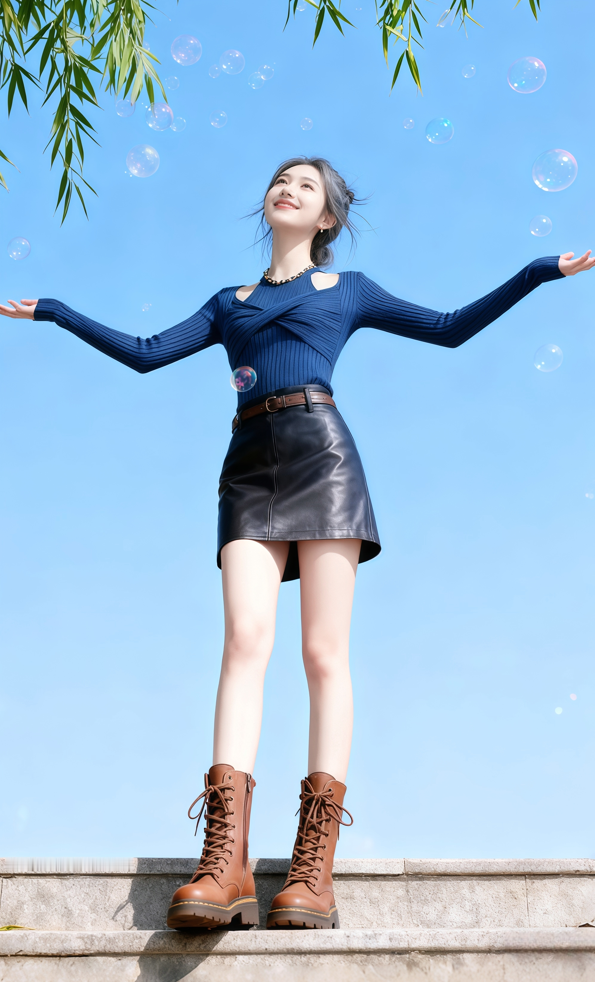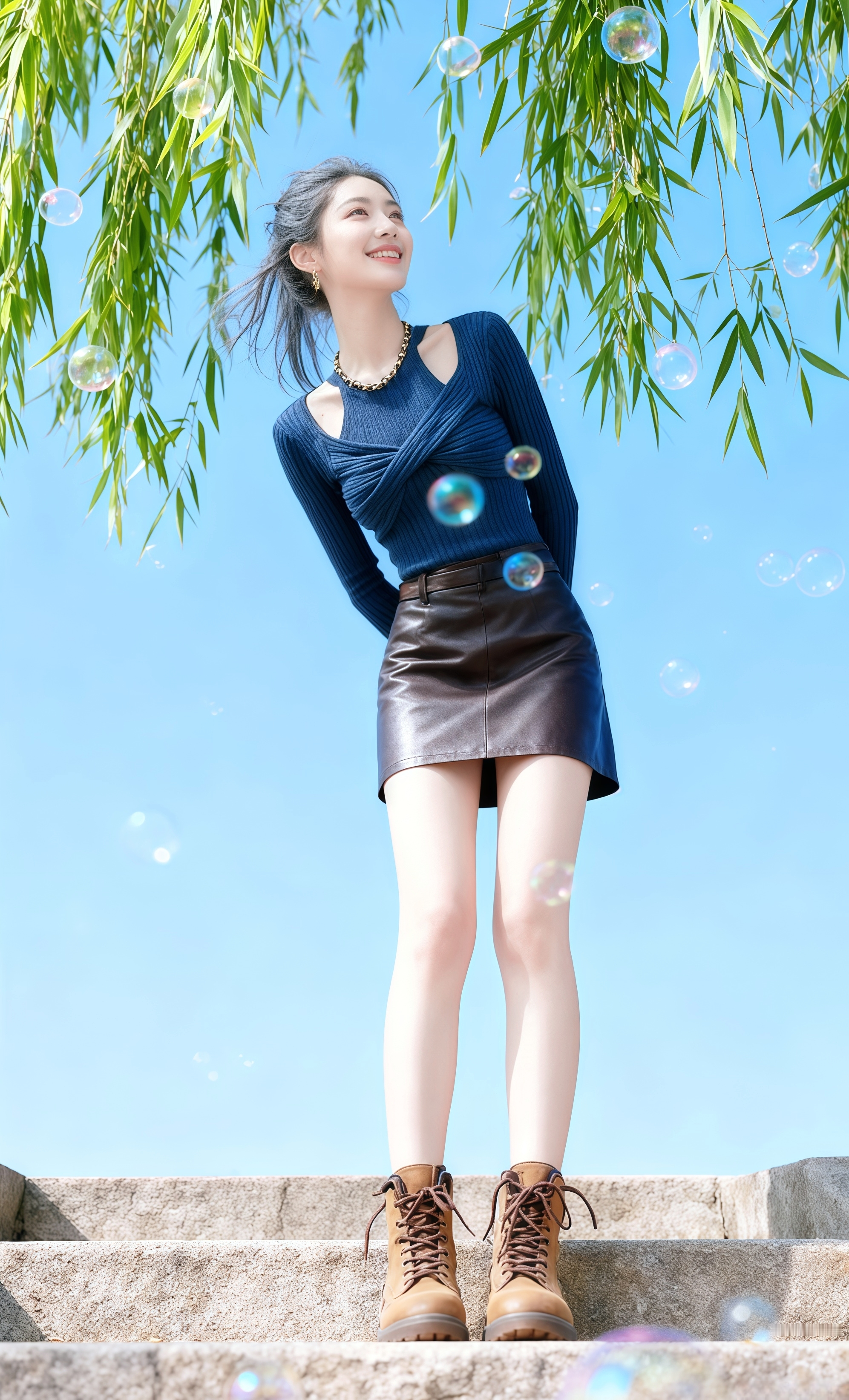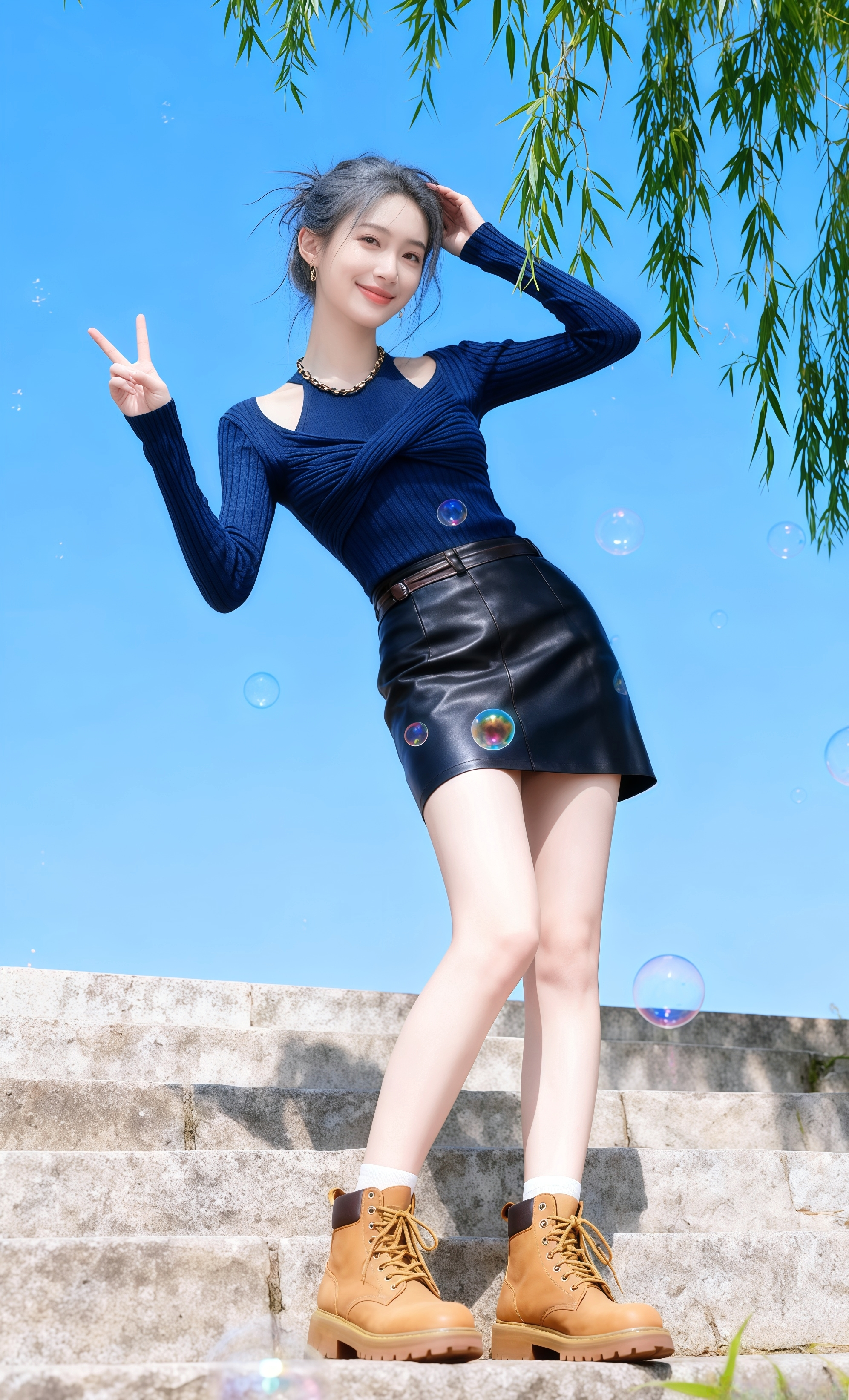 《石阶上的蓝衫》 沈星野蹲在石阶下吹泡泡时,抬头撞进了苏晚的笑里。她穿藏青针织衫,皮裙裹着纤细的腰,咖色马丁靴踩在台阶上,烟灰色盘发被风撩起几缕碎发。 “你挡我光啦。”苏晚偏头,指尖戳破个晃到她眼前的泡泡,光斑落进她眼里。 沈星野攥着泡泡棒起身,刚想说什么,就见她抬手比心——竹叶垂在她身后,蓝天衬得她冷白皮像浸了光,笑容软得像风里的绒絮。 “拍张照?”他摸出手机,镜头里的她身体微斜,泡泡绕着她转成圈。 按下快门时,苏晚忽然凑近:“这张要发我哦。” 沈星野指尖发烫,连带着那句“早想拍你很久了”,一起埋进了风里。 要不要我帮你续写他们交换联系方式的片段?