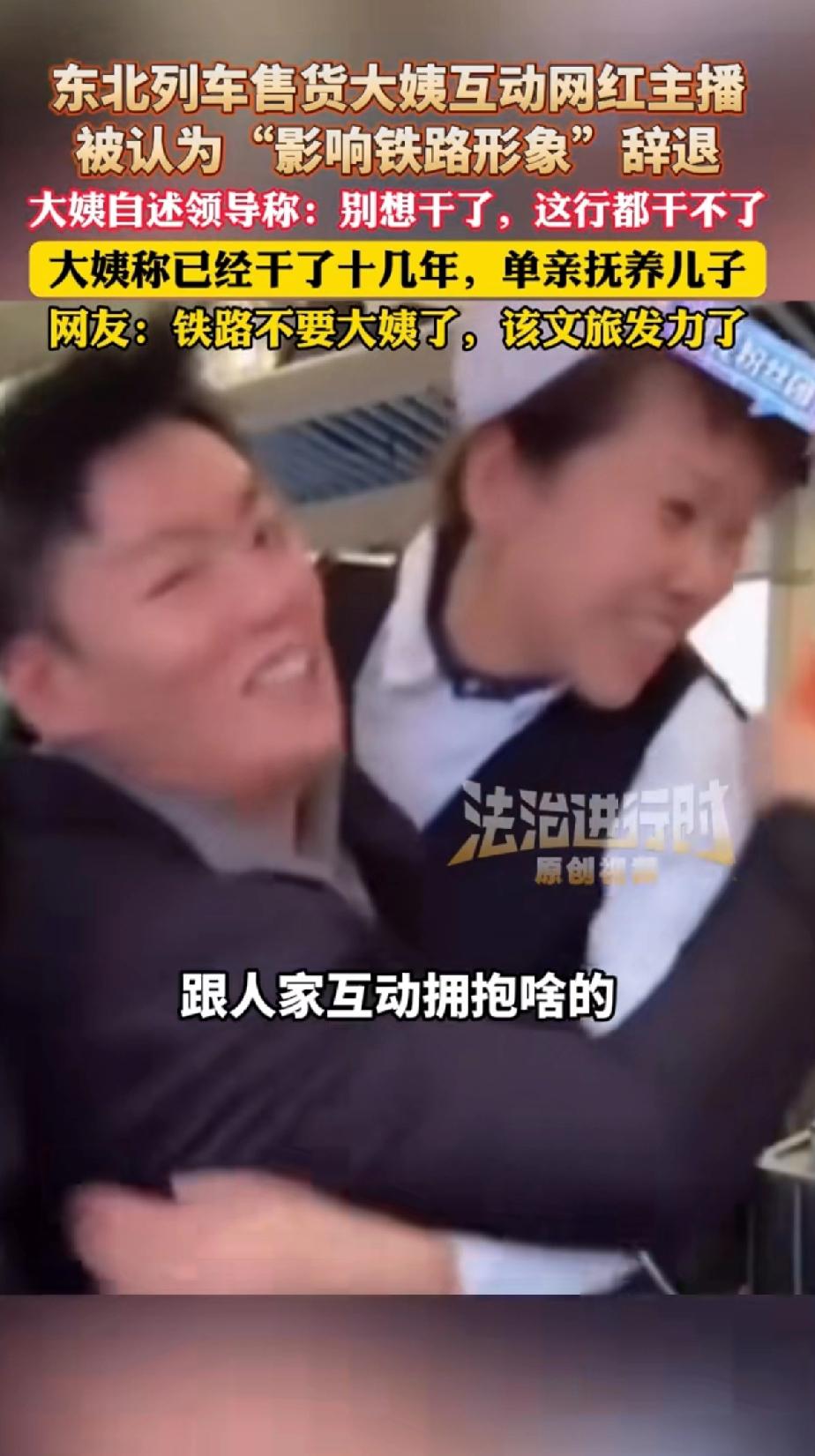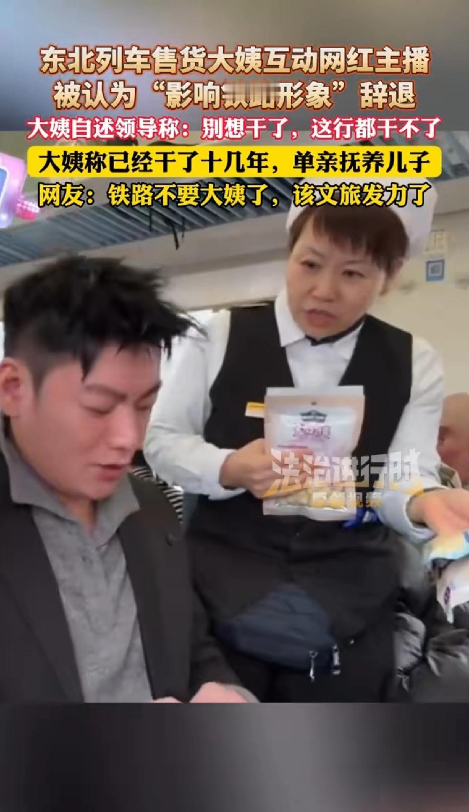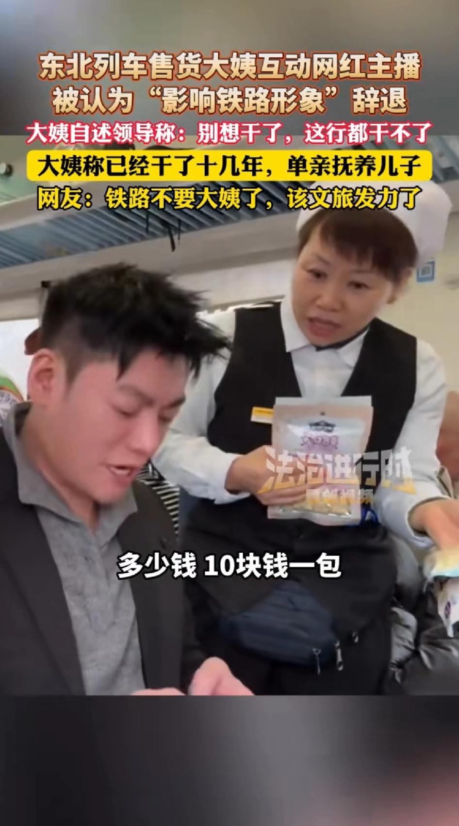 东北列车售货大姨互动网红主播 被认为“影响铁路影响”辞退。大姨自述领导称:别想干了,这行都干不了了。 大姨干这工作十几年了,单亲抚养儿子,常年回不了家,就为供读书的孩子,多不容易。 当时网红小伙拿烧鸡跟大姨“以物换物”,大姨热情回赠果脯,双方热情互动,多有人情味儿。 可铁路局倒好,直接把人开了。哈尔滨铁路客服说正在调查核实,佳木斯客运段称售货人员是外包的。 瞅半天也不知道到底怎么就影响铁路影响了?再说铁路该是什么形象? 冬天本是哈尔滨文旅出彩的时候,这么搞寒了多少人的心,希望能给大姨一个公道。