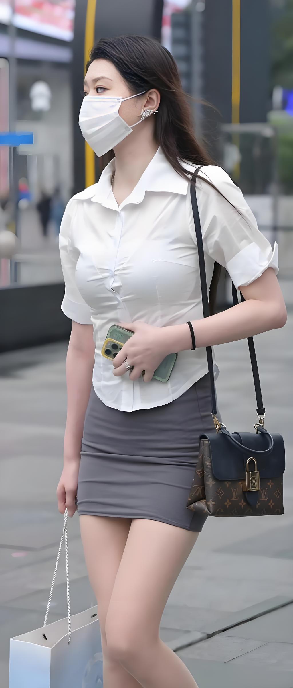晒晒你的今日穿搭吧 职业装 都市时尚女孩,白色衬衫搭配灰色短裙,手提时尚包包,享受城市生活。