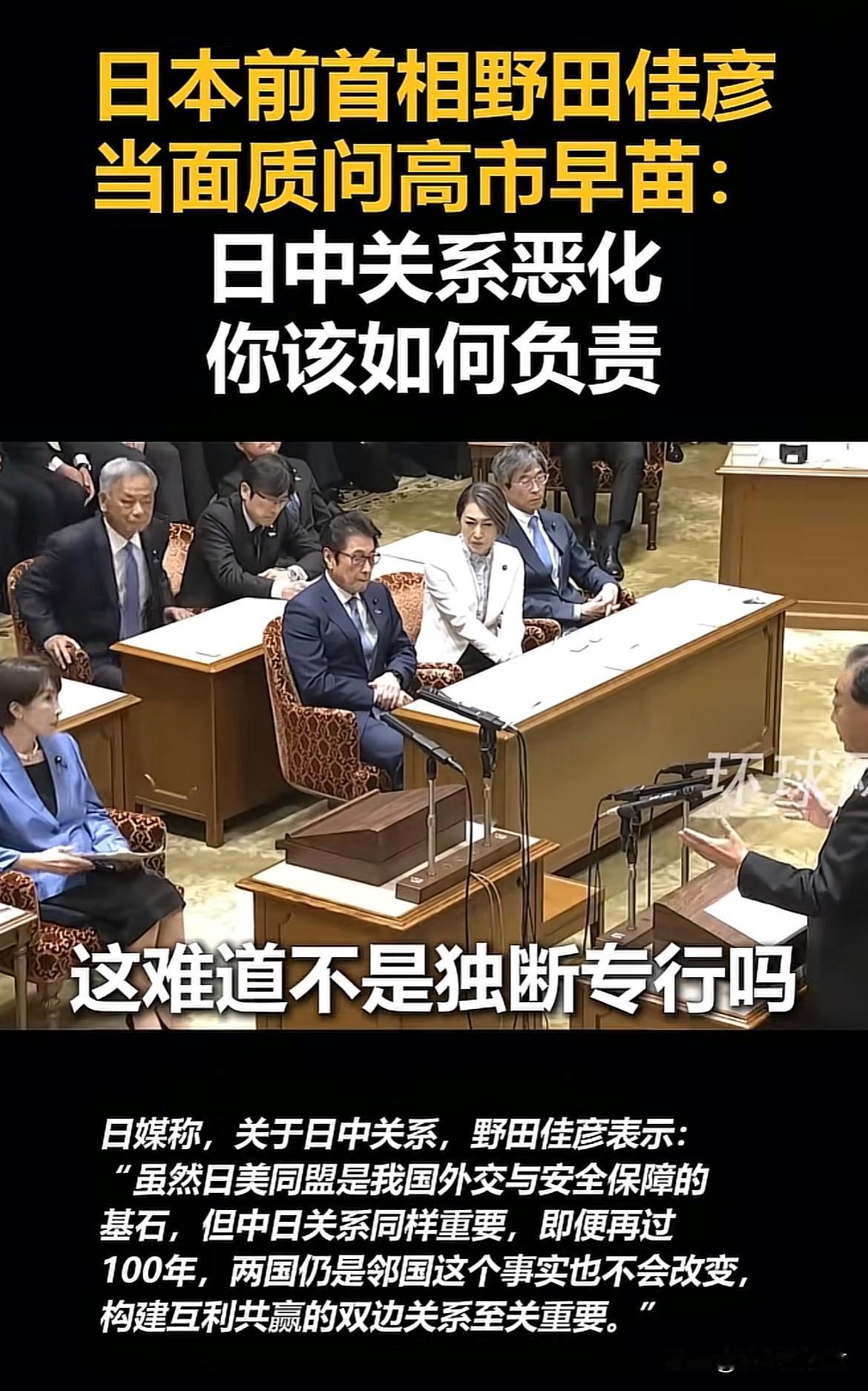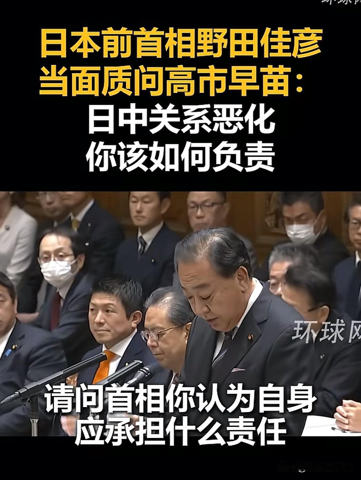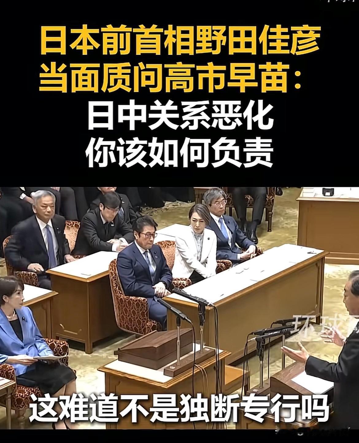 日本前首相野田佳彦质问高市早苗, 你的言论导致中日关系恶化,你自身应该承担什么责任? 看高市早苗一脸的严肃。没精打采的。不再笑嘻嘻。另一位白衣服的女士在看向高市早苗。很显然是说她呢! 参加会议的人多数都是一脸严肃,情绪不高。 你就看她那个坐姿,就该知道回答的是什么了。 你们觉得高市早苗会怎么回答。 她应该承担什么责任?