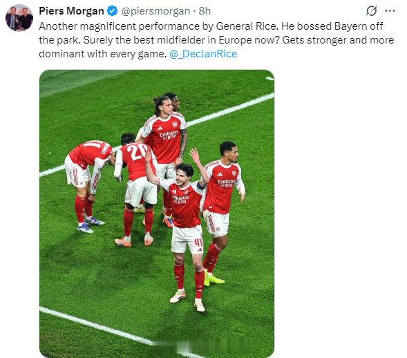 摩根更新社媒:赖斯又一次奉献了精彩绝伦的表演。他完全掌控了拜仁的比赛。他无疑是目前欧洲最好的中场球员吗?而且他每场比赛都在进步,表现得更加出色 阿森纳3比1拜仁 阿森纳欧冠五连胜 阿森纳著名教授