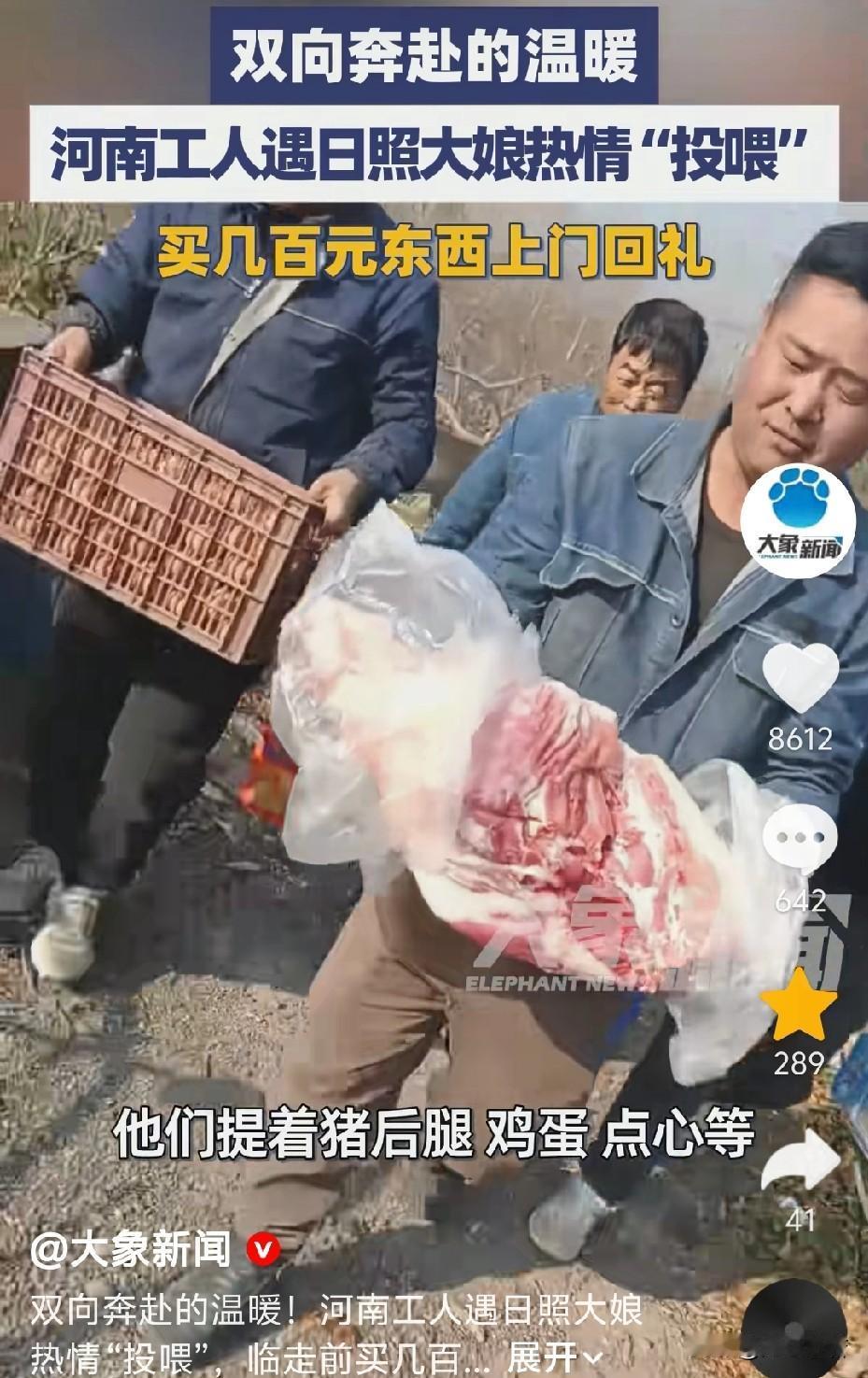 近日,山东日照,一名河南小伙子和工友们来日照架高压线,因为口渴向本地一位大妈讨水喝。大妈一看这群浑身是土的工人,年纪跟自家孩子差不多大,还大老远跑来干活,心疼得不行。 11月8日的山东日照,原本应该是萧瑟的深秋,气温却反常地蹿到了20多度。对于在五莲县岳村镇后逊峰村那片荒坡上架设高压线的河南电力工人们来说,这多出来的几度热量,混合着黄土坡上扬起的粉尘,把嘴里的干渴感放大了好几倍。 随身带的水早就喝干了,这群壮实的大老爷们被日头和体力活逼得没招,工头带着几个工友硬着头皮去敲了附近一家农户的门。 这群人满身是灰,工服上全是泥点子,若是碰上讲究点的人家,哪怕不给白眼,心里头也得犯嘀咕。可57岁的村民卢桂花大门一开,剧情并没有按着“冷遇”的本子走。 哪有什么凉水应付?卢大妈看着这群小伙子灰头土脸的样子,眉头一皱,那个属于长辈特有的“心疼劲儿”瞬间就上来了。 转身进屋,提出来的是两暖壶滚烫的日照绿茶。在山东农村,若是只给你舀瓢凉水那叫打发,泡了热茶那是把你当客。 但真正把这群河南汉子“整破防”的,是后面这连续五天的“流水席”。 这事儿不仅是解渴那么简单,第二天一大早,卢大妈提着个竹篮子直接冲到了工地上。先是热腾腾的蒸红薯、芋头,还配了极下饭的虾皮小菜,那是农村怕孩子饿着才有的那种实在劲儿。 这还不算完,后头几天大妈像是把这片工地当成了自家的分灶头,大铁锅炖出来的白菜粉条子滋滋冒油,最绝的是有一天居然端出了一盘炸得金黄酥脆的“知了猴”。 稍微懂点山东民俗的都知道,知了猴这东西在鲁菜食谱里地位不低,要么是年夜饭上的“顶配”,要么是丈母娘招待新女婿的高规格硬菜。 把这种级别的“待客之道”拿来招待一群萍水相逢的架线工人,这种超规格的尊重,直接击穿了工人们心里的那层防线。 有工人说,那是过年才舍得吃的菜,大妈这一举动,哪是把他们当工人看,分明是看成了自家那帮出门在外让大人牵肠挂肚的孩子。 这就是最质朴的“母亲视角”。卢大妈那句“看你们就像看见自己孩子”,把地域、身份的界限全抹平了。常年在外讨生活的务工者,习惯了被嫌弃身上脏、声音大,突然被这么一份毫无杂质的善意包裹,几个河南爷们鼻子发酸也就不足为奇了。 既然人家拿出了真心,咱就不能让这心意落地上。这群河南小伙子先是想凑钱给大妈,想把这饭钱给结了。 但这钱在卢桂花眼里简直就是把关系搞远了,死活不收。钱给不出去,这事儿在工人们心里就成了一个必须要了结的“情债”。 等到这帮工人转场去邻村作业时,这笔“账”终于有了机会算清。他们没把这份善意当成理所当然的过眼云烟,而是特意绕了路,像是去走正经亲戚一样再次登门。 手里提的东西极有讲究——几十斤重的整猪后腿、整箱的牛奶、成盘的鸡蛋和点心。在农村的人情账簿里,猪后腿那是相当重的回礼,往往只有至亲之间才会这么送。 大妈一看这场面又急了,心疼这帮卖力气挣钱的孩子乱花钱。这时候,工头王全保说了一句比任何漂亮话都管用的大白话:“好事就得双向奔赴,俺们去亲姨家也是拿这些东西,早就把您当成亲姨了。” 这一刻,猪后腿和知了猴完成了某种奇妙的等价交换。不是钱换物,而是“尊严”换“敬重”。 高压线能输送几万伏的电流,但这人和人之间这种你看得起我、我记着你的电流,这热度比11月那场反常的日头还要暖人心脾。什么是最好的关系?就是你不拿我当外人,我也绝不拿你当路人。 信息来源:“喝凉水哪行”,河南工人被山东大娘热情“投喂”—大众网