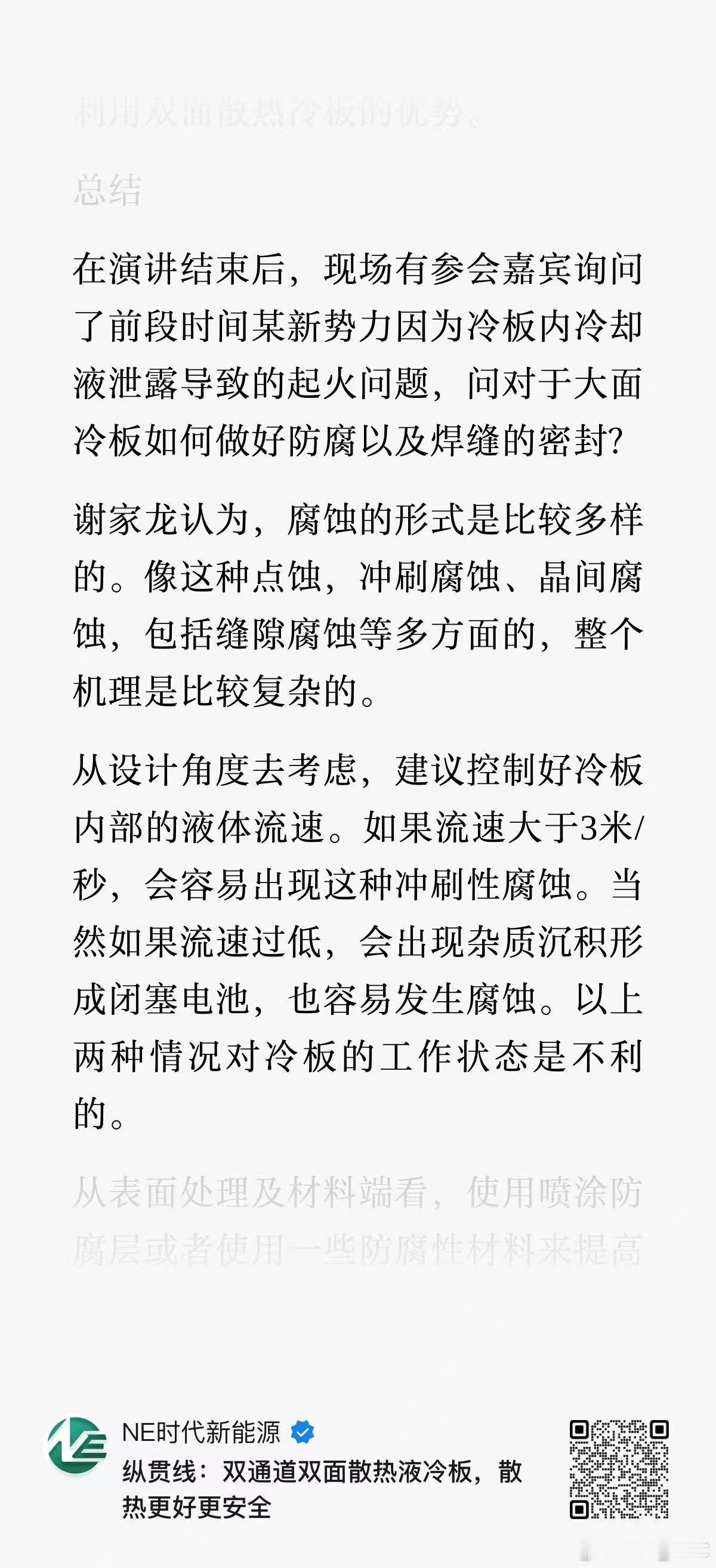对于大面冷板如何做好防腐以及焊缝的密封?有专家认为,腐蚀的形式是比较多样的。像这种点蚀,冲刷腐蚀、晶间腐蚀,包括缝隙腐蚀等多方面的,整个机理是比较复杂的。从设计角度去考虑,建议控制好冷板内部的液体流速。如果流速大于3米/秒,会容易出现这种冲刷性腐蚀。当然如果流速过低,会出现杂质沉积形成闭塞电池,也容易发生腐蚀。以上两种情况对冷板的工作状态是不利的。