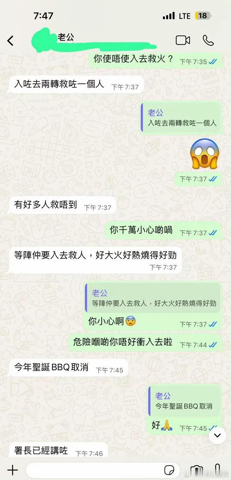 香港消防员妻子发文! 一句“冇得唔入”(“不得不进去”) 让人落泪… “今年圣诞BBQ取消”这句话才更是让人扎心,意思就是取消了准备在圣诞节期间举行的烧烤派对。这次救援不得不进去,这既是自己的职责,也是自己的使命。 其实有很多消防员从火场出来后都会有创伤后应激障碍(PTSD),因为他们看见了一些“烧焦物”,导致有些消防员从此以后看见烧烤就想吐。 可以想象作为家属的她们。比我们更难过,更担心消防员的安慰,也希望能救更多的人,然后平平安安的回来。 最后,也希望救援人员该休息还得休息,自己的身体也很重要。愿逝者安息,向消防员致敬,希望大家都注意安全,愿天佑同胞,不再有人员伤亡,所有的救援人员辛苦了,向你们致敬,加油!