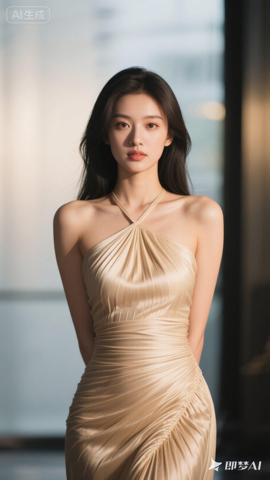 香槟金缎面礼服如月光凝固,交叉颈线勾勒出清冷肩颈,褶皱间流淌着高级质感,在朦胧光