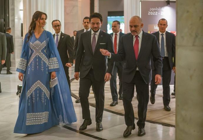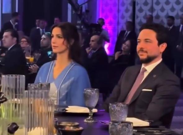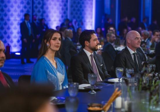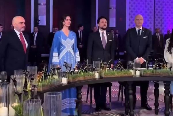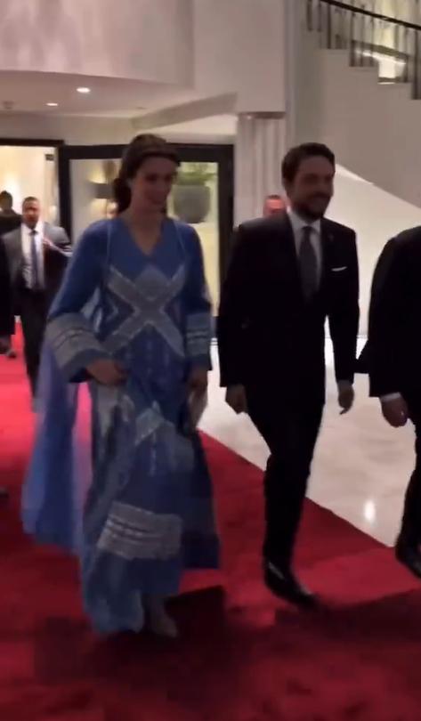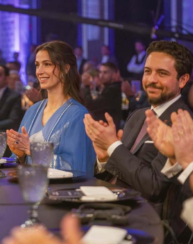 约旦王储携娇妻出席足球协会晚宴[爱慕] 王储妃拉杰瓦穿了色彩清丽的刺绣长裙, 这种传统民族长裙不仅代表着文化传承, 也因其华丽精美彰显出女性的身份和魅力[赞]