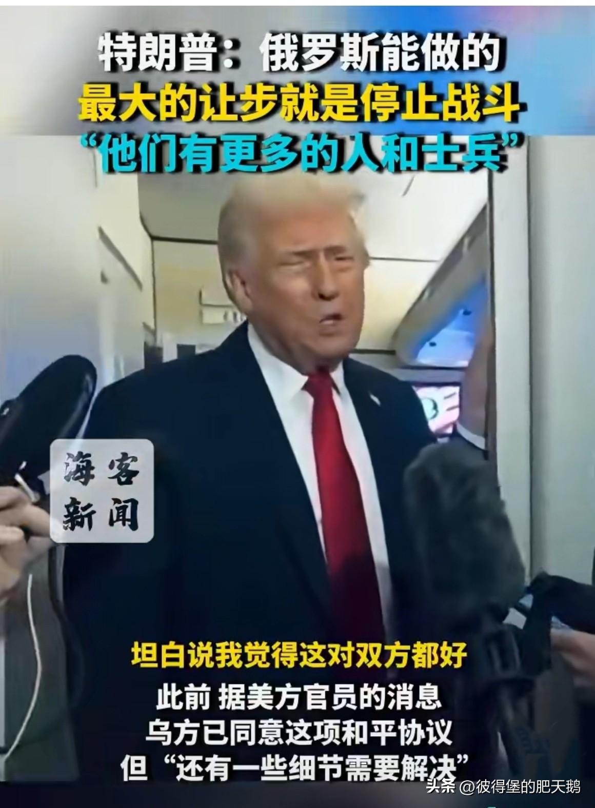 虽然特朗普说话经常赤裸裸,但他这次就俄乌停战面对记者问“俄罗斯能做什么让步?”,他的回应是一句大实话:“他们最大的让步就是停止战斗”——这属于脱光了说话了。 特朗普这话听着糙,却把战争那点最本质的道理扒得一干二净,所谓 “停止战斗就是最大让步”,压根不是什么新鲜论调,而是人类几千年来打仗最实在的规矩 —— 毕竟战场上的优势从来不是摆设,占着上风的一方但凡按下暂停键,本质上都是放弃了本该到手的更多好处。 打仗这事儿说到底就是抢利益的硬手段,优势方手里的筹码从来都是打出来的,要么是地盘,要么是话语权,要么是让对手割地赔款的资格。就拿 1967 年的第三次中东战争来说,以色列把 “优势方停火即让步” 演得明明白白。 当时阿拉伯联军总兵力 32.8 万,作战飞机 576 架,坦克四千多辆,看着比以色列的 25 万人马、286 架飞机气派多了。结果以色列玩了把闪电战,早上 7 点多出动飞机炸机场,三个小时就把阿拉伯国家 451 架飞机炸得只剩残骸,地面部队更是一路平推,6 天就占了约旦河西岸、西奈半岛等 6.57 万平方公里的土地,差不多是自己原有国土的三倍。 那会儿以色列伤亡才 983 人,阿拉伯国家那边伤亡被俘加起来超过 6 万,光是难民就冒出 50 万,战场主动权牢牢攥在以色列手里。要是接着打,埃及、叙利亚这些国家恐怕得丢更多地盘,但以色列见好就收宣布停火,这哪是停火,简直是把到嘴的肥肉又吐了回去,说是最大让步一点不夸张。 再往前数到 1962 年的中印边境自卫反击战,中国军队的操作更能说明问题。当时印度军队在边境挑事,结果被我军一顿反击打得溃不成军,不光歼灭敌人 5000 多人,还生擒了印军第七旅旅长达维尔准将,总共抓了 3212 名俘虏,其中光校级以上军官就有 50 多个。 按照印度国防部后来的报告,他们光死亡和失踪就超过 3000 人,还有几千士兵被困在原始森林里差点饿死。而我军在军事上完全占优,已经控制了关键战略要地,继续推进毫无压力,但就在 11 月 21 日突然宣布停火,第二天就全线停止进攻,还主动撤回到之前的实际控制线内侧 20 公里。 要知道那会儿不少印军还被包围着,压根不知道已经停火,这种手握绝对优势却主动踩刹车的操作,不是最大让步是什么?毕竟再打下去,印度付出的代价只会更大。 朝鲜战争里联合国军的表现也透着这层逻辑。1953 年签字停火的时候,联合国军手里的牌可不算差,光是美军就占了 “联合国军” 总兵力的 90% 以上,还有 15 个国家跟着凑数,装备更是甩开中朝军队几条街。 上甘岭战役里,他们在不足 4 平方公里的阵地上投了 5000 多枚炸弹,打了 190 多万发炮弹,虽说没拿下阵地,但整体火力优势一直没丢。要是真硬着头皮打下去,他们有的是弹药和兵源,可最终还是坐下来签了停战协定。 要知道之前麦克阿瑟还喊着 “圣诞节前结束战争”,想一路打到鸭绿江,最后却只能接受以三八线为界的对峙局面,这其实就是放弃了继续推进的企图,对占尽装备优势的联合国军来说,停火就是最实在的让步。 再看现在的俄乌冲突,2024 年的战场态势早就把这道理摆得清清楚楚。俄军靠着国内军工产能发力,年初挫败乌军反攻后一路推进,拿下了阿夫杰耶夫卡、恰索夫亚尔这些重镇,直逼波克罗夫斯克,在乌东阵地战里稳稳占着主动。 反观乌军,得靠西方援助才能撑着,所谓的 “反攻” 没拿到多少好处,后来只能转入战略防御。这时候要是谈停火,俄军等于放弃了继续扩大控制区的机会,毕竟他们的炮火正对着乌军的战略要地,再推一把就能拿到更多谈判筹码。特朗普说 “停止战斗就是最大让步”,说白了就是看透了这点 —— 战场上占优的一方,每多停火一天,就等于少拿一天的利益。 人类打仗几千年,从来都是这个路数。要么是两边打得精疲力尽,谁也赢不了谁,只好坐下来谈;要么就是占优势的一方觉得 “差不多了”,主动停下脚步,而这停下的每一步,都是放弃了本可以用枪炮换来的利益。别觉得 “让步” 就得是割地赔款、低头认错,在战场上,能攥着优势却不继续打,本身就是最昂贵的让步,特朗普不过是把这层窗户纸捅破了而已。