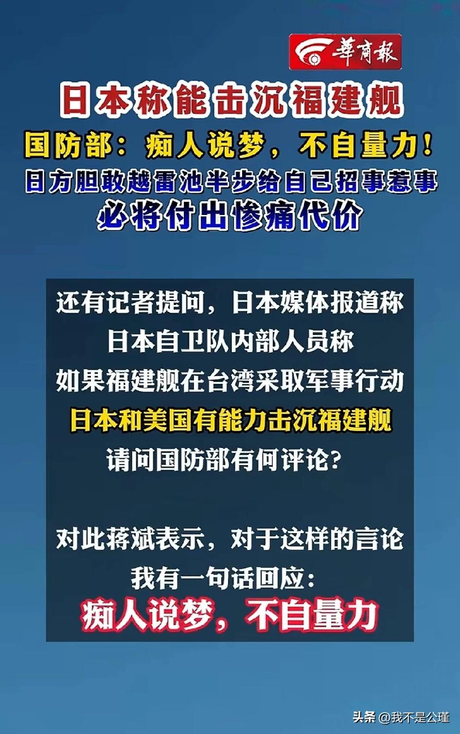 我想对日本说的是,想击沉福建舰,那对应的就是日本沉没! 日本自卫队内部人士又放狂言了,声称能击沉“福建舰”。 国防部霸气回了八个字:“痴人说梦,不自量力”。 对于痴人说梦的樱花国来说,不自量力是对它们的最好解释。 美国的敲打似乎让它们没了颜面,就想着通过口嗨来满足下它们的不服,继而狂躁的表示能击沉福建舰。这种不自量力的想法,只会让日本沉没成为现实。 如网友们所言,如果再次开战,没有投降,没有俘虏,没有日本! 福建舰 福建号航母舰 福建号航母 福建号舰 福建号试航 日本沉没