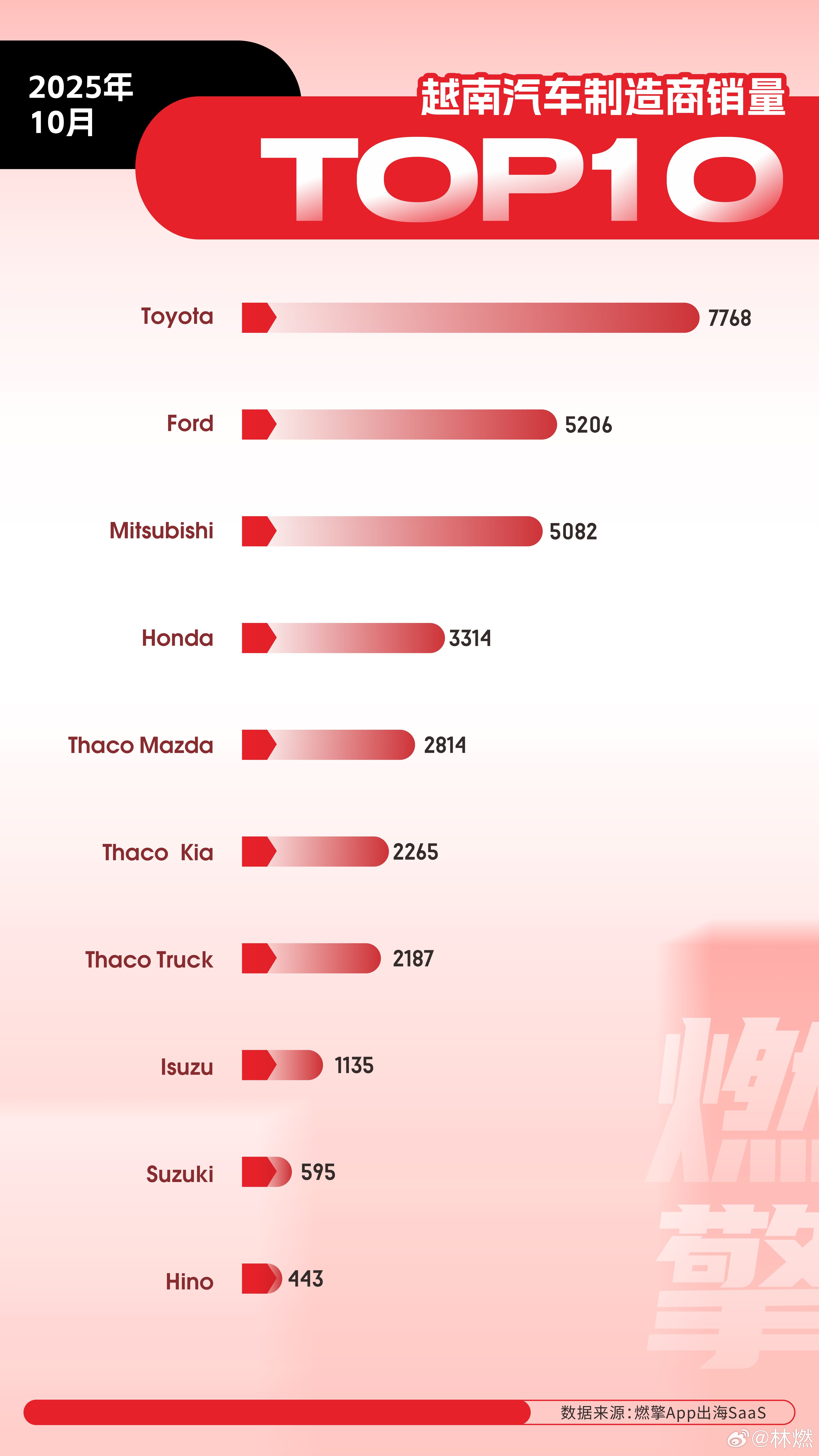 越南车市,日系独大10月,越南汽车市场呈现出日系品牌主导、本土企业依托渠道优势参与竞争、商用车需求持续稳固的鲜明特征。这一市场格局与越南消费者注重实用性、信赖本地渠道的购车习惯高度契合。日系品牌凭借其产品实用性和可靠性占据市场领先地位。丰田以7768辆的月销量位居榜首,福特和三菱分别以5206辆和5082辆的销量紧随其后。这些品牌的车型精准契合了越南复杂的道路条件和使用需求:丰田的经济型轿车适应城市通勤,福特的皮卡和三菱的SUV则能胜任乡村非铺装路面行驶。越南本土汽车组装商Thaco通过代理国际品牌在市场竞争中表现出色。其代理的马自达、起亚等品牌均进入销量榜单,显示出Thaco凭借本地渠道优势成功拓展市场份额。特别值得一提的是,Thaco Truck以2187辆的销量专注于满足越南货运需求,在商用车细分市场建立了稳固地位。商用车市场方面,五十铃和日野分别以1135辆和443辆的销量上榜,反映出越南物流运输行业的持续发展带来的稳定需求。这些以装载能力和耐用性著称的商用车品牌,已成为当地商户和运输从业者的重要选择。未来,日系品牌的领先地位预计将继续保持,若能针对越南特殊路况进一步优化车辆通过性,其市场优势将更加巩固。Thaco有望继续借助其渠道优势扩大代理品牌阵容,进一步提升市场份额。随着越南物流行业的持续发展,商用车市场的需求将保持稳定,相关品牌也将从中受益。大v聊车