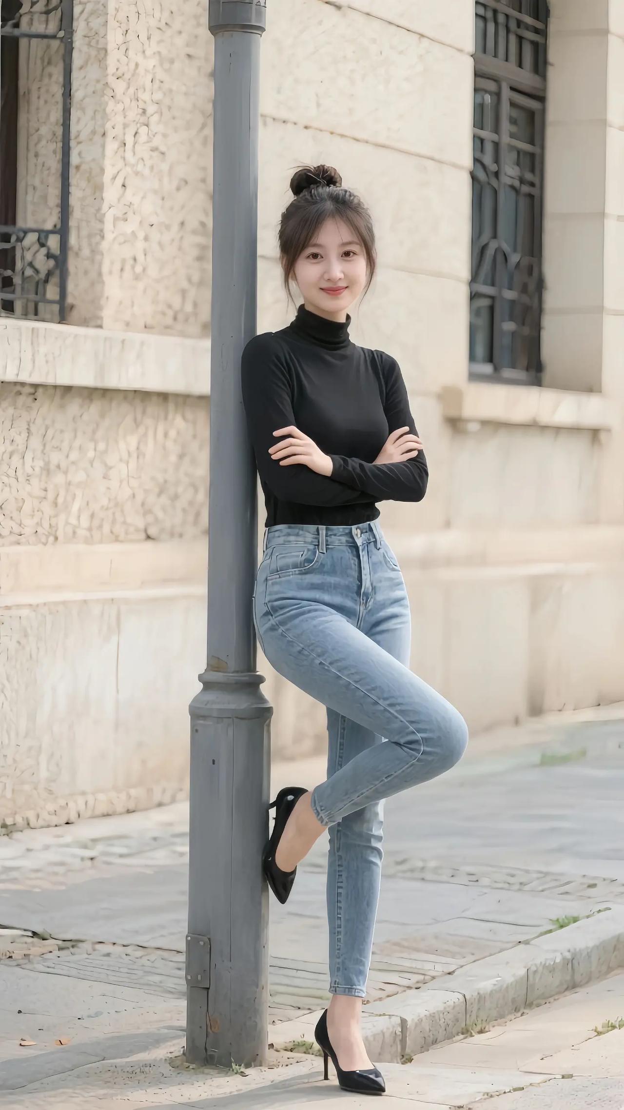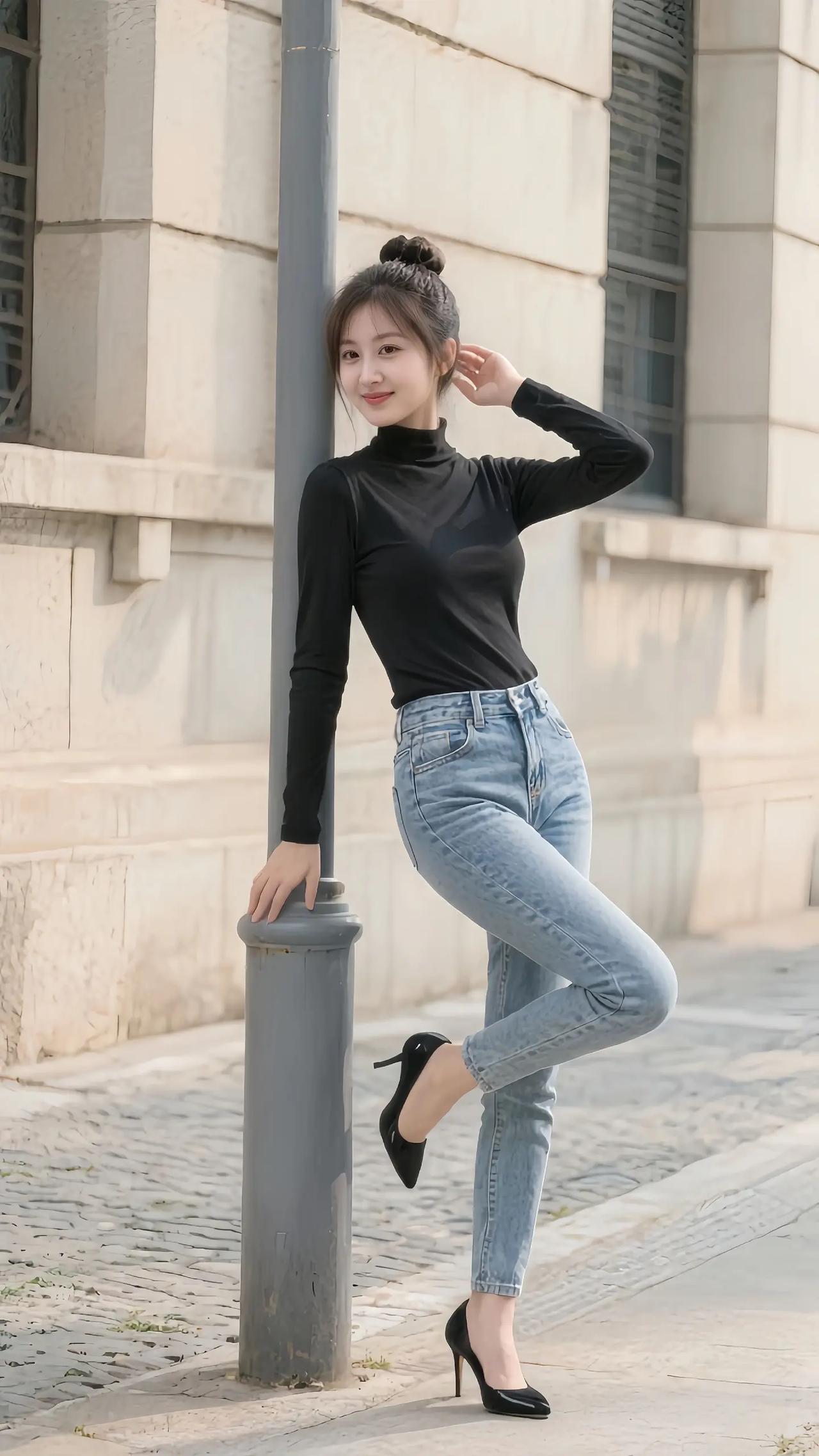 都市时尚少女,黑色高领衫搭配牛仔裤,脚踩黑色高跟鞋,优雅自信。晒晒少女靓影