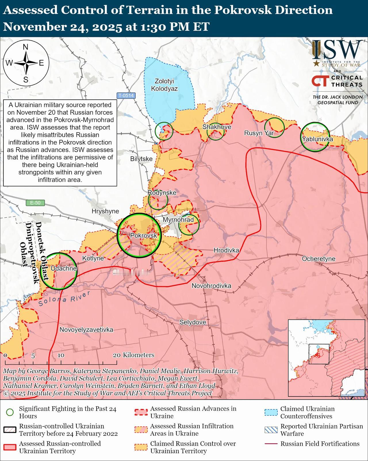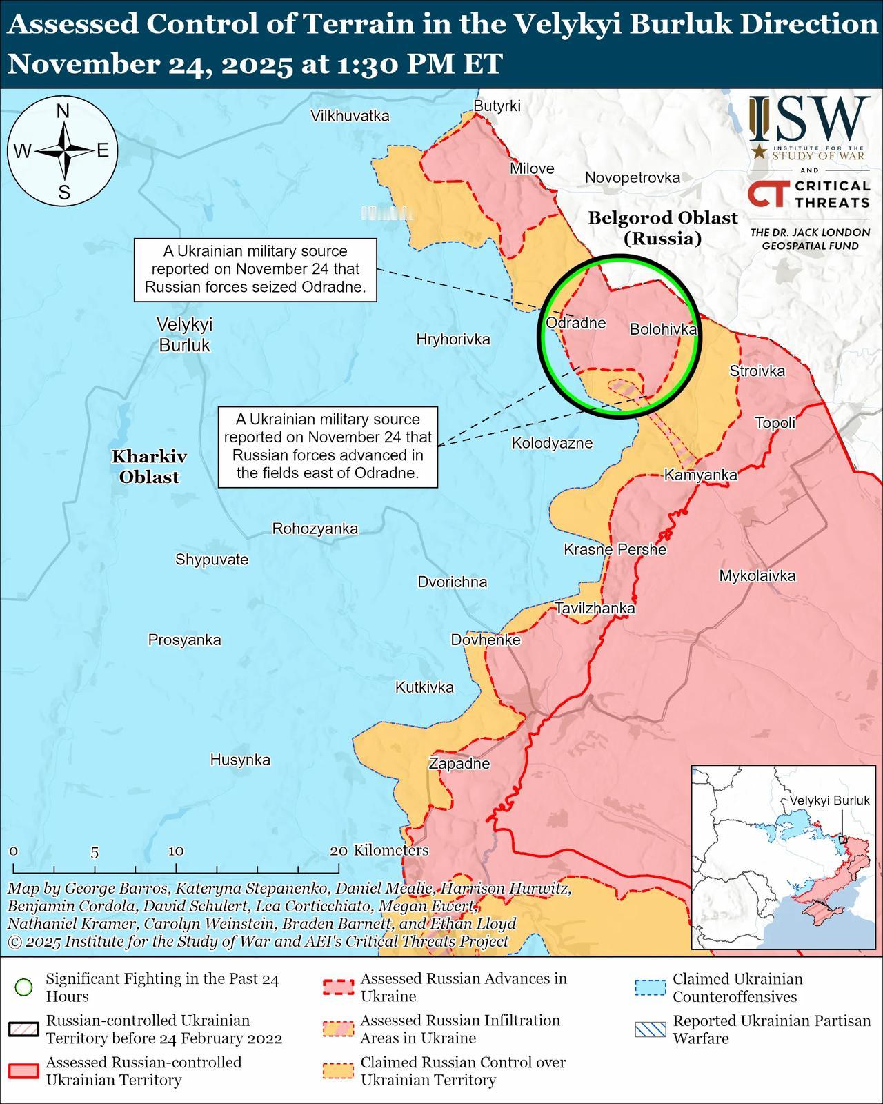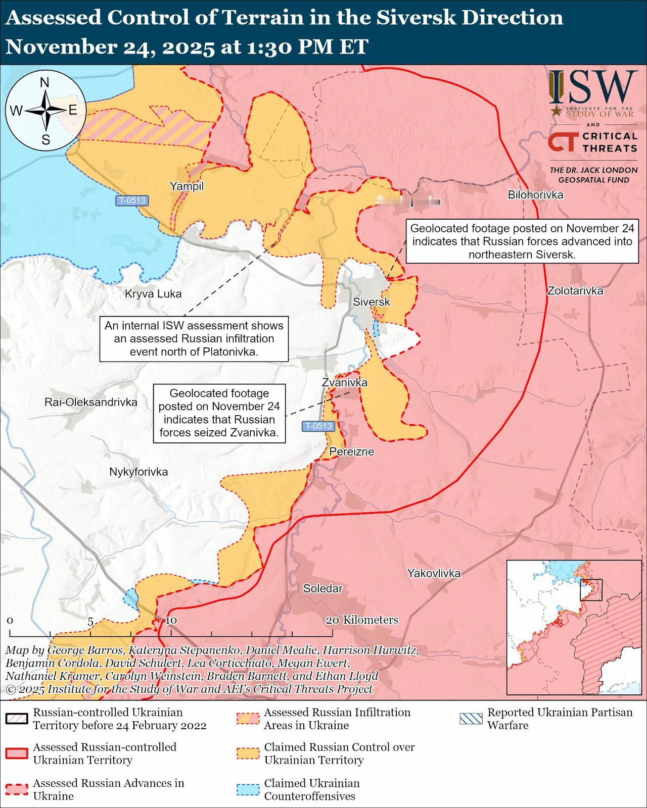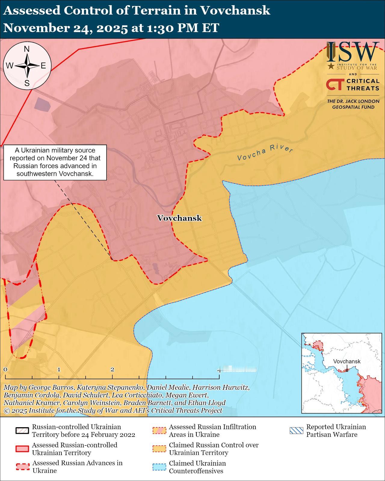2025年11月24日俄乌前线战报 分战线军事行动总结 1. 乌克兰对俄本土行动 ・11 月 23~24 日夜间,乌克兰打击俄罗斯下诺夫哥罗德州克斯特沃能源设施(卢克石油炼油厂、石化厂),现场出现爆炸声;俄方称击落7架无人机,未确认设施受损情况 2. 北部战线(苏梅州,俄目标:建立边境缓冲带) ・俄军在苏梅市周边(博亚罗 - 列扎奇、金德拉季夫卡等地)发起进攻,无推进;俄军事博主称,俄军因路线遭乌军监控进攻失败,1427摩步团等部队长期未轮换,士气低落、纪律混乱(出现暴动) ・乌军在库尔斯克州泰特基诺仍有破坏侦察小组活动,并以 TOS-1A 温压炮反击俄军 3. 东部主战场(俄核心目标:夺顿涅茨克全州、卢甘斯克剩余地区) ・哈尔科夫州 俄军:沃昌斯克方向推进至市区墓地,火箭弹摧毁其北部城区;大布尔卢克方向夺取奥德拉内及周边 乌军应对:无人机拦截俄军后勤,在沃昌斯克西部组织防御,阻止俄军迂回 ・卢甘斯克州 俄军:库皮扬斯克、博罗瓦、斯洛维扬斯克 - 利曼方向小规模进攻,试图渗透乌军防线 乌军:开发雾天无人机侦察技术,维持阵地,组织平民撤离(库皮扬斯克余560人,博罗瓦余1000 人) ・顿涅茨克州 俄军行动:锡韦尔斯克夺取扎瓦尼夫卡;波克罗夫斯克空袭公寓楼(使用FAB-3000滑翔弹);新帕夫利夫卡、大迈哈伊洛夫卡推进至沃恰河沿岸 乌军应对:波克罗夫斯克反击清除部分街区的俄军;多布罗皮利亚一周内歼敌659、俘9人,毁8辆装甲车 4. 南部战线(俄目标:逼近扎波罗热市、维持前线) ・胡利亚波莱:俄军127摩步师夺取扎蒂什亚(胡利亚波莱以东2.6公里),渗透小组进入市区;乌军在周边(叶霍里夫卡、多布罗皮利亚等地)组织反击 ・扎波罗热西部:俄军在奥里霍夫周边(马拉托克马奇卡、新安德烈夫卡等地)进攻,无推进;俄博主称马拉托克马奇卡为 “灰色地带”,乌军否认俄军夺城 ・赫尔松方向:俄军在安东诺夫斯基大桥周边的进攻尚无进展;乌军无人机控制俄后勤线(奥列什基公路),俄车辆每5次运输仅能成功1次;俄方称将所有通行车辆视为合法目标(注意,这是违反国际法的,虽然战争条件下讲这没啥用[捂脸]) 5. 白俄罗斯与北约领空冲突 ・11月23~24日夜间,立陶宛监测到超40个白俄罗斯入侵气球,拉脱维亚监测到约30个;立陶宛维尔纽斯国际机场两度暂停运营 ・ISW判断:此举属俄罗斯 “零阶段”(信息与心理铺垫)行动,为潜在 “俄 - 北约战争” 做准备;白俄罗斯是俄事实上的共犯 6. 美乌和平计划推进与调整 ・美乌代表团将美方初始的28点和平计划缩减至19点,移除与乌克兰无关内容 ・关键共识:乌克兰加入北约遵循北约 “共识决策机制”;愿从当前战线讨论领土问题,拒绝俄方领土交换提议;而“冻结的1000亿美元俄罗斯资产将用于乌克兰重建”的条款已移除 ・后续流程:需特朗普与泽连斯基敲定领土、北约入盟条款;美方先与乌方确定最终计划,再协调欧洲伙伴,最后以 “胡萝卜加大棒” 策略说服俄方 7. 俄罗斯战场推进与顿涅茨克州态势 ・俄方推进速度仅为步行速度,ISW 评估夺取顿涅茨克州剩余地区需数年战役,将耗损俄大量人力物资 ・俄方短板:2022年至今未能夺取顿涅茨克州 “堡垒带”(此为乌军防御核心),2014年其以来多次尝试均告失败;当前战场依赖雾、雨天气降低乌军无人机威胁 8. 俄方对和平计划的态度 ・俄官方(克里姆林宫顾问乌沙科夫、国家杜马议员斯卢茨基)及极端民族主义者(军事博主)均拒绝美乌修订版计划,称 “欧洲版提议将延长战争”,试图甩锅欧洲 ・俄内部主张:部分议员称仅美俄为谈判相关方,应排除乌、欧意见;军事博主呼吁以武力实现战争目标,反对妥协 ・ISW判断:俄无意开展善意谈判,或通过拖延谈判争取战场推进时间,再以军事进展施压乌方投降 9. 关键战场攻防焦点补充 ・俄军近期推进区域:沃昌斯克、大布尔卢克、科斯蒂安蒂尼夫卡 - 德鲁日基夫卡战术区 俄空中、导弹与无人机行动 ・11 月 23~24 日夜间,俄发射 162 架无人机(含 80 架 “沙赫德” 无人机),它们从俄本土(库尔斯克、布良斯克等地)及克里米亚起飞打击乌克兰基础设施 ・乌军击落其中的125架,但仍有37架俄军无人机击中了15处目标;第聂伯罗彼得罗夫斯克州、哈尔科夫州超7万用户断电;哈尔科夫、切尔尼希夫等州港口、农业、能源设施受损;切尔尼希夫市下午遭袭致3名平民受伤,扎波罗热州一辆小巴遭FPV无人机打击,致1人死亡 评估与数据来源 ・ISW 仅评估俄战争罪对军事行动的影响 ・数据来源:仅使用公开信息(俄乌官方通报、社交媒体、商业卫星图像、西方媒体) 更多精彩内容,尽在